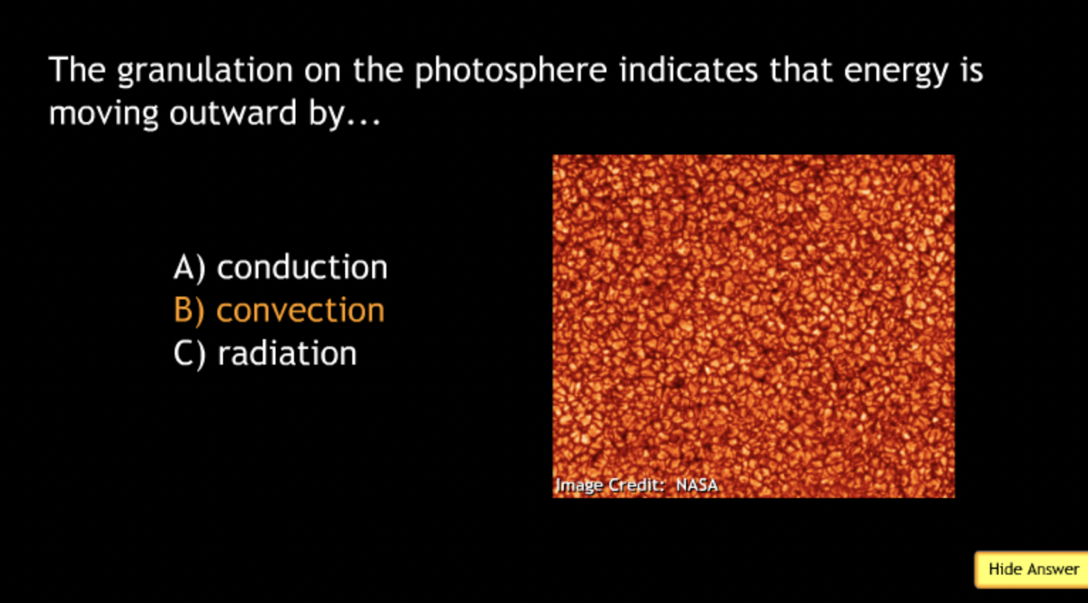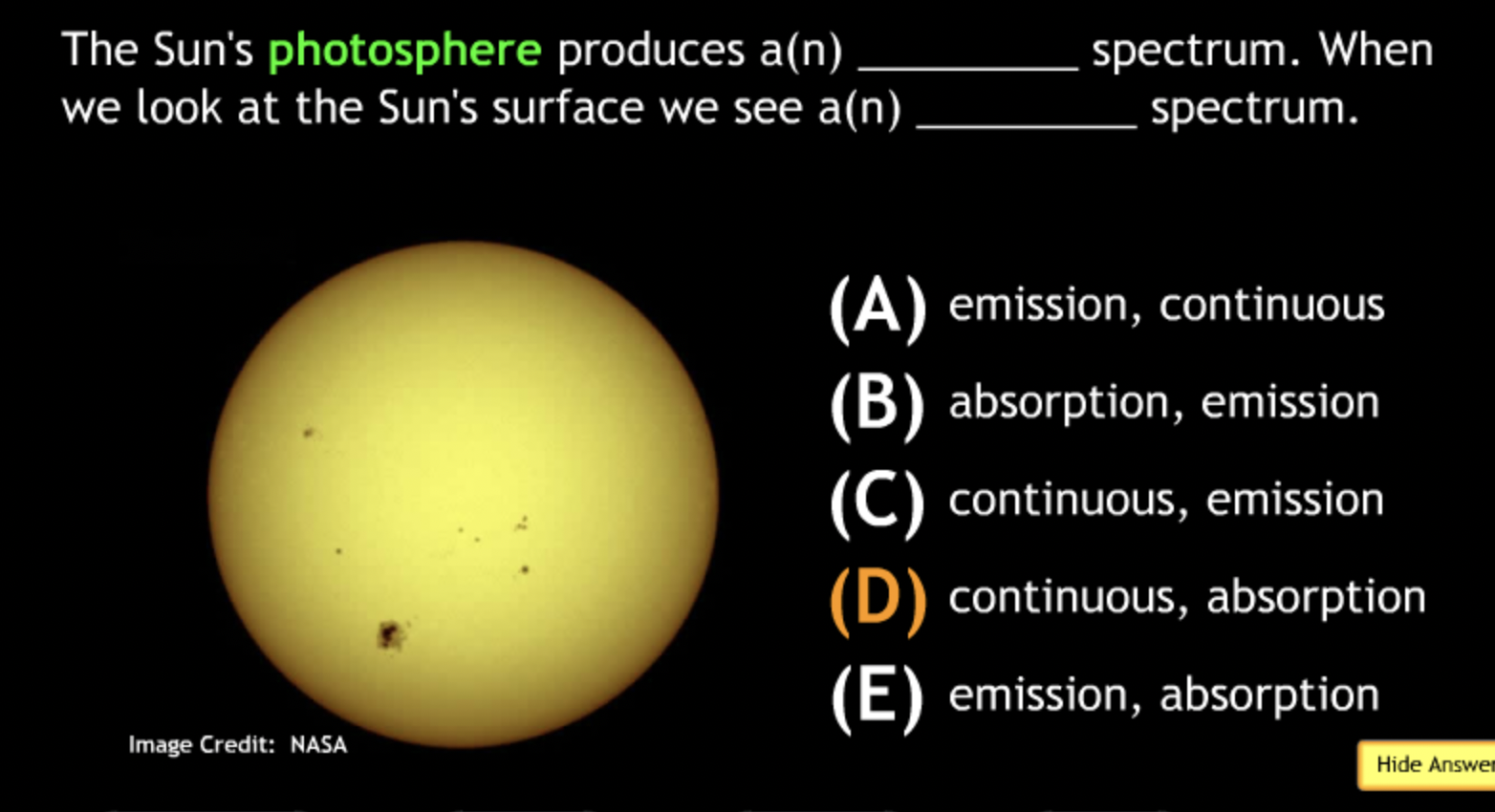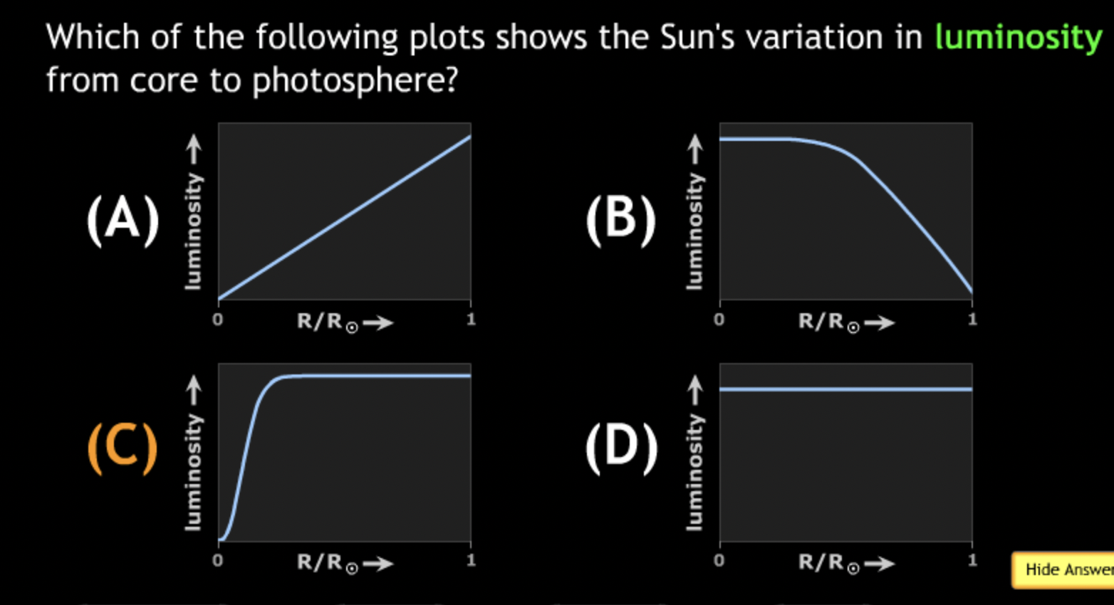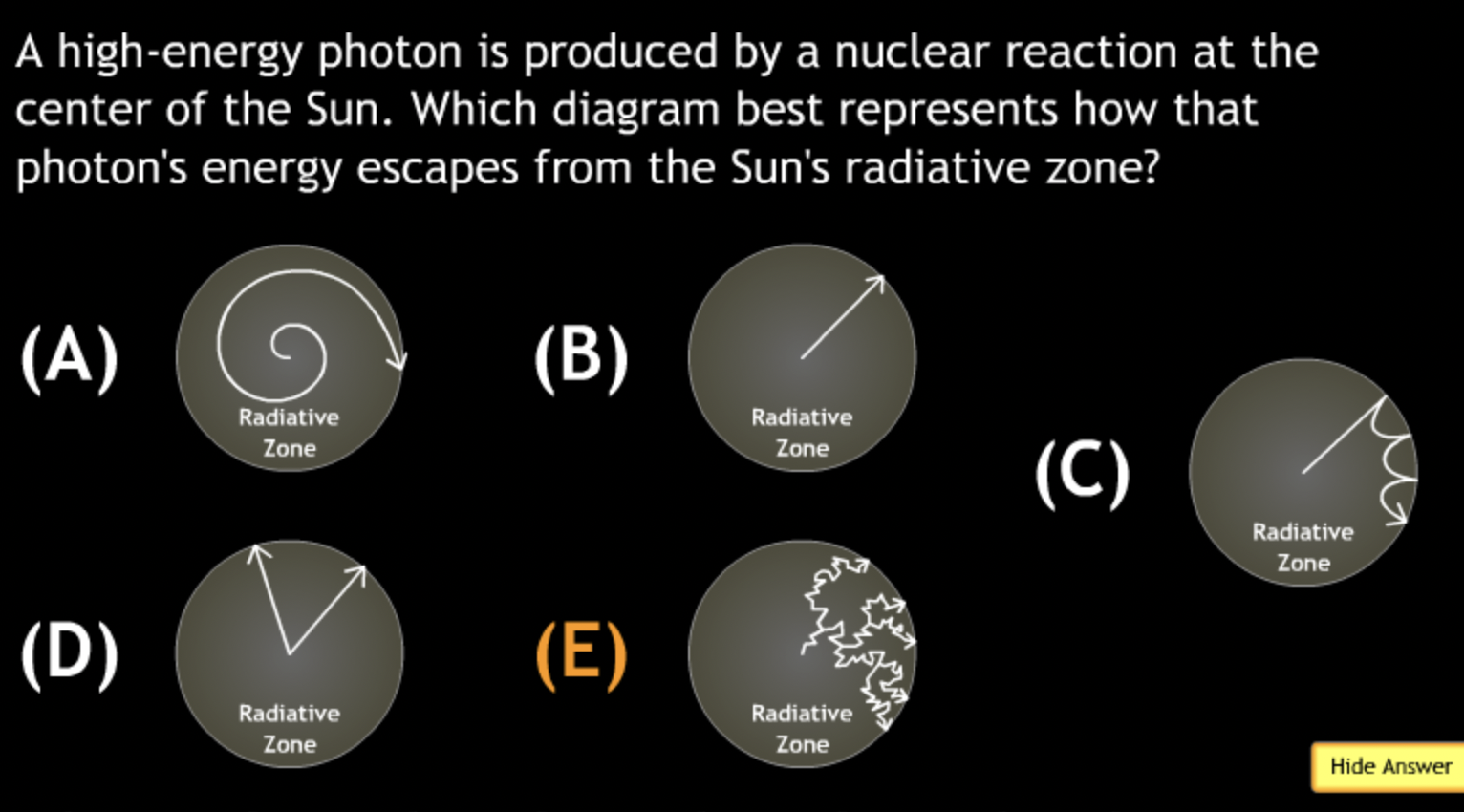 A high-energy photon is produced by a nuclear reaction at the center of the Sun. This energy will leave the Sun… much later as a bunch of lower-energy photons.