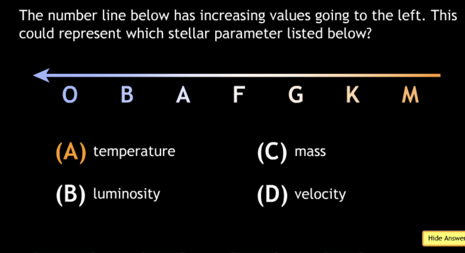 Which of the following sequence of stellear properties (luminosity L, mass M, radius R, and temperature T) are in increasing order of the ranges of possible values? T, M, R, L