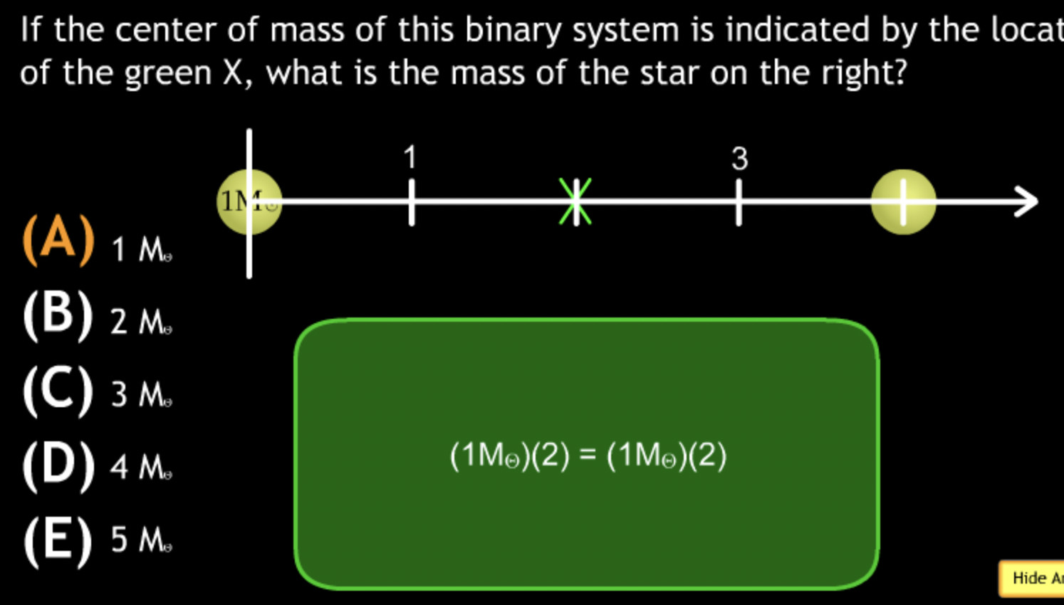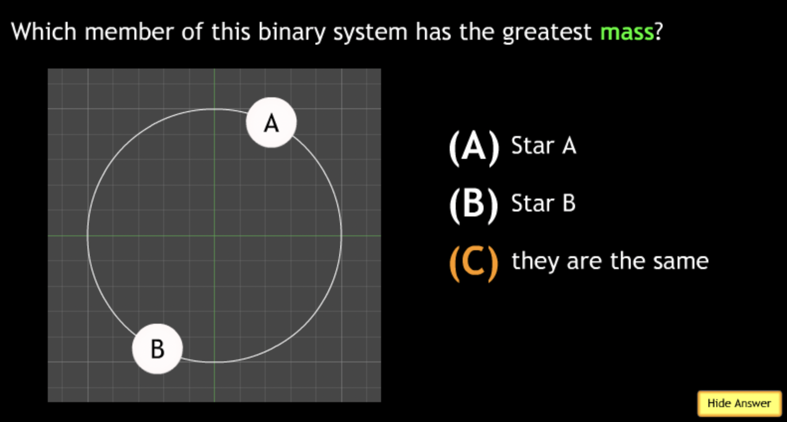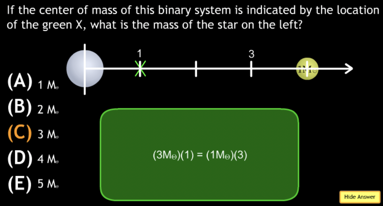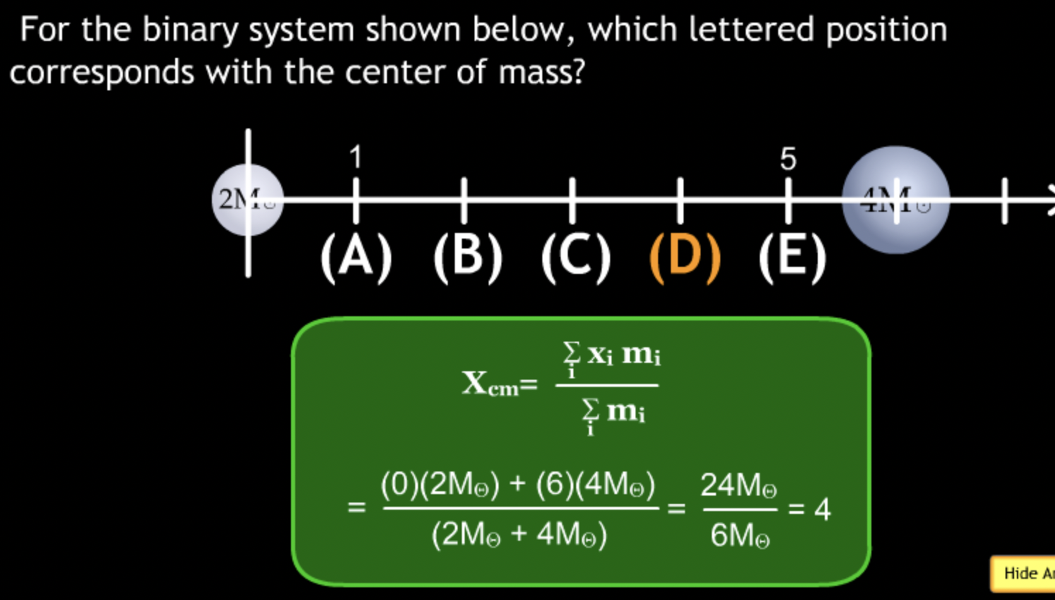 The center of mass in a binary star system is… on a line connecting the two stars. closer to the more massive star.