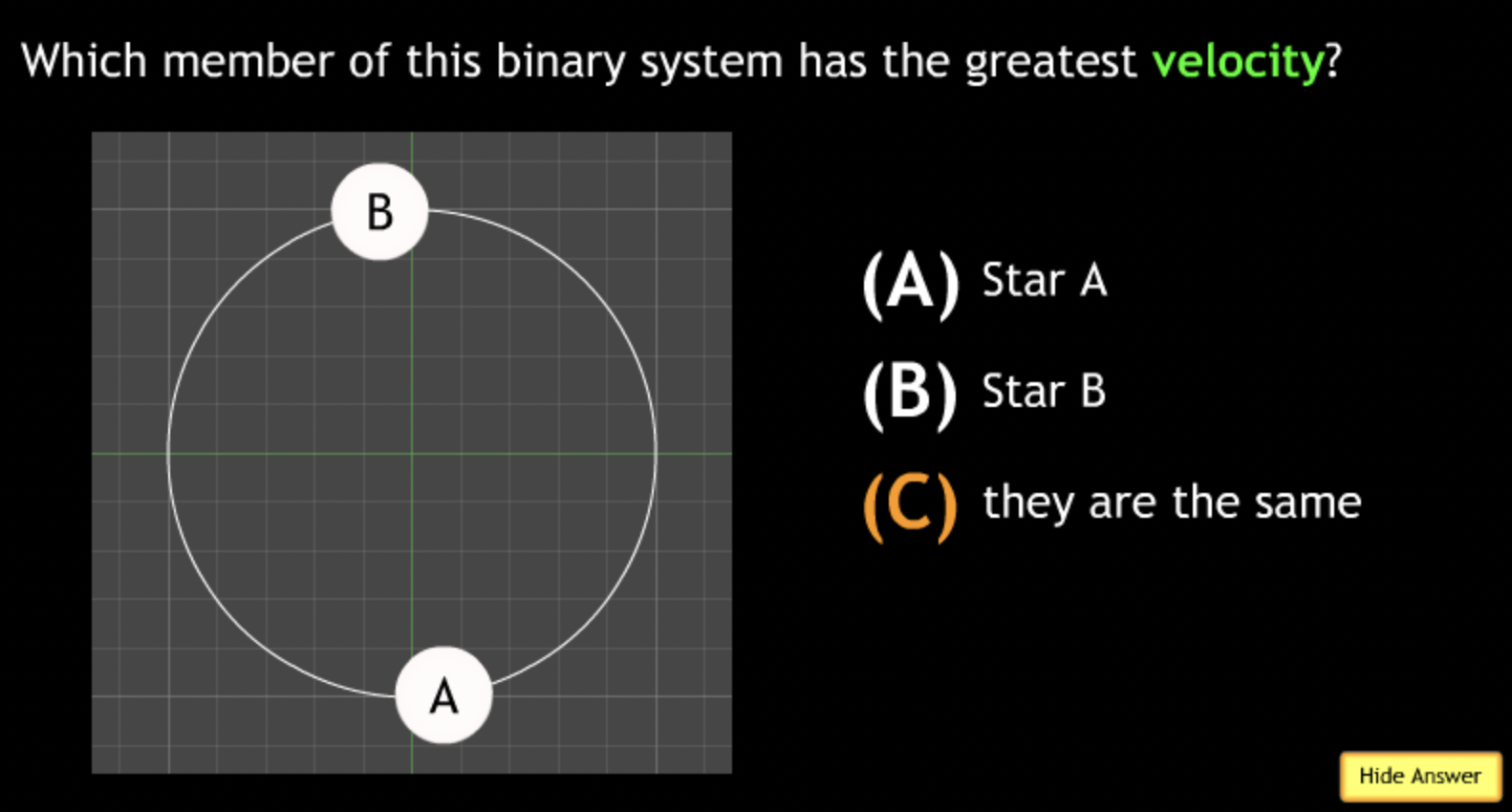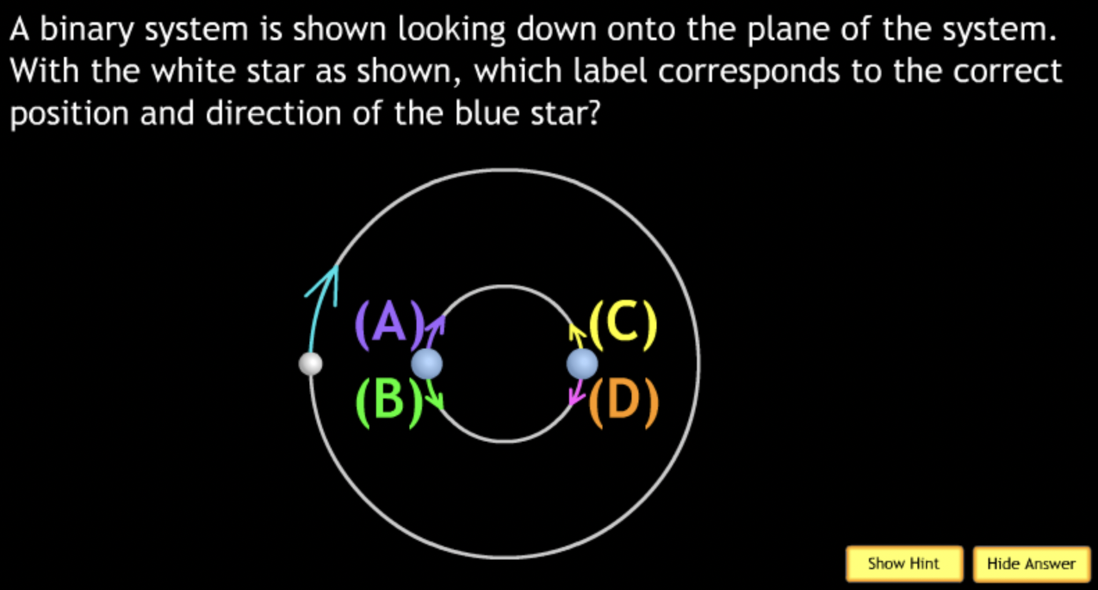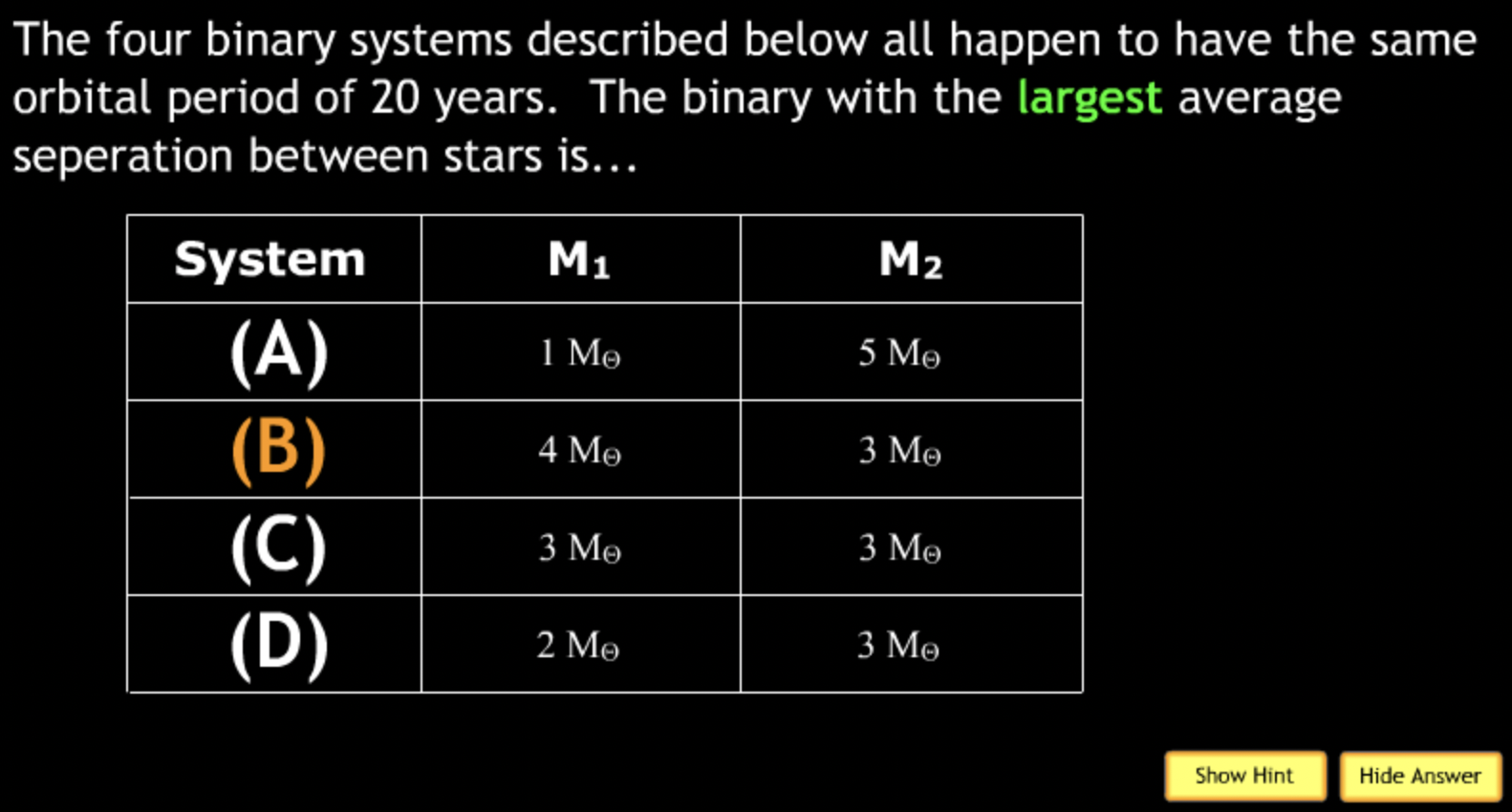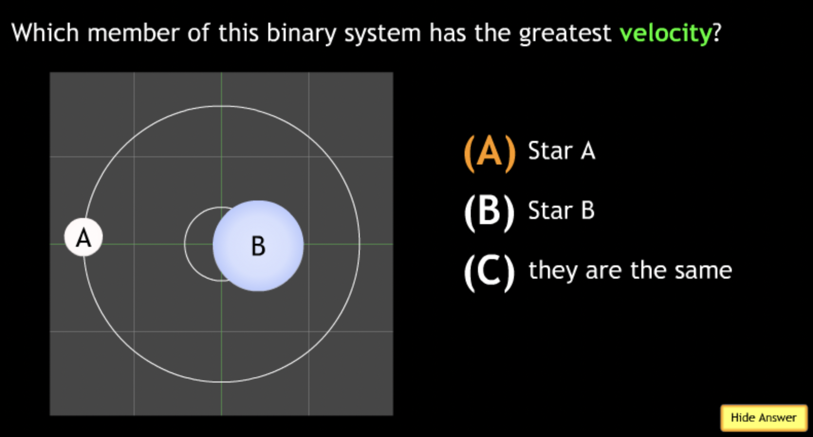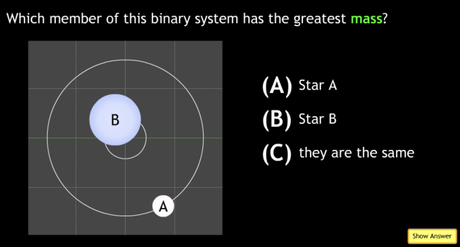The center of mass in a binary star system is… on a line connecting the two stars. closer to the more massive star.