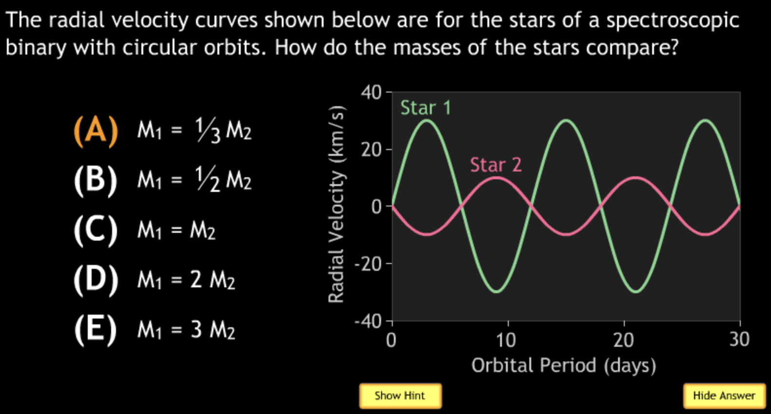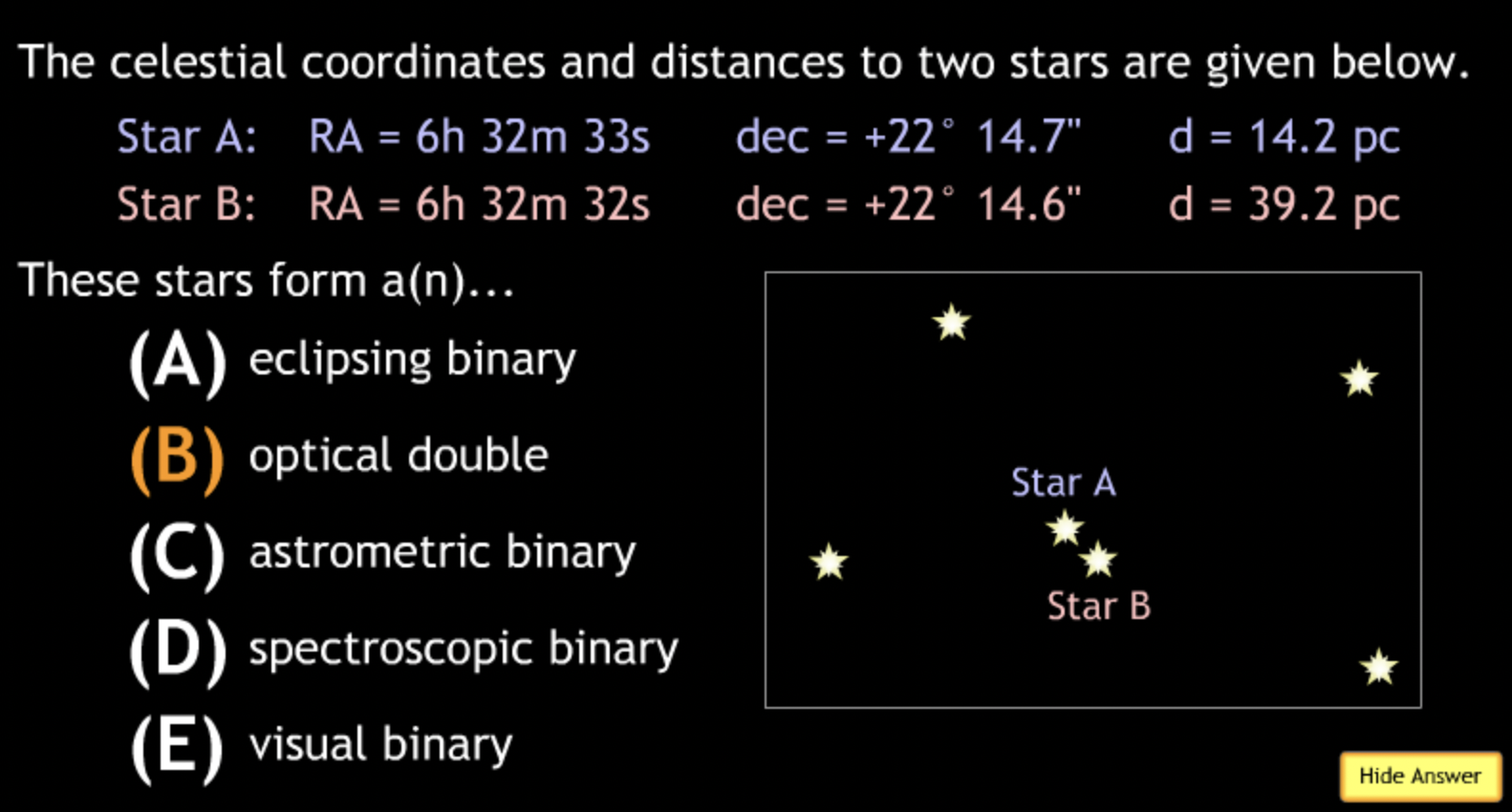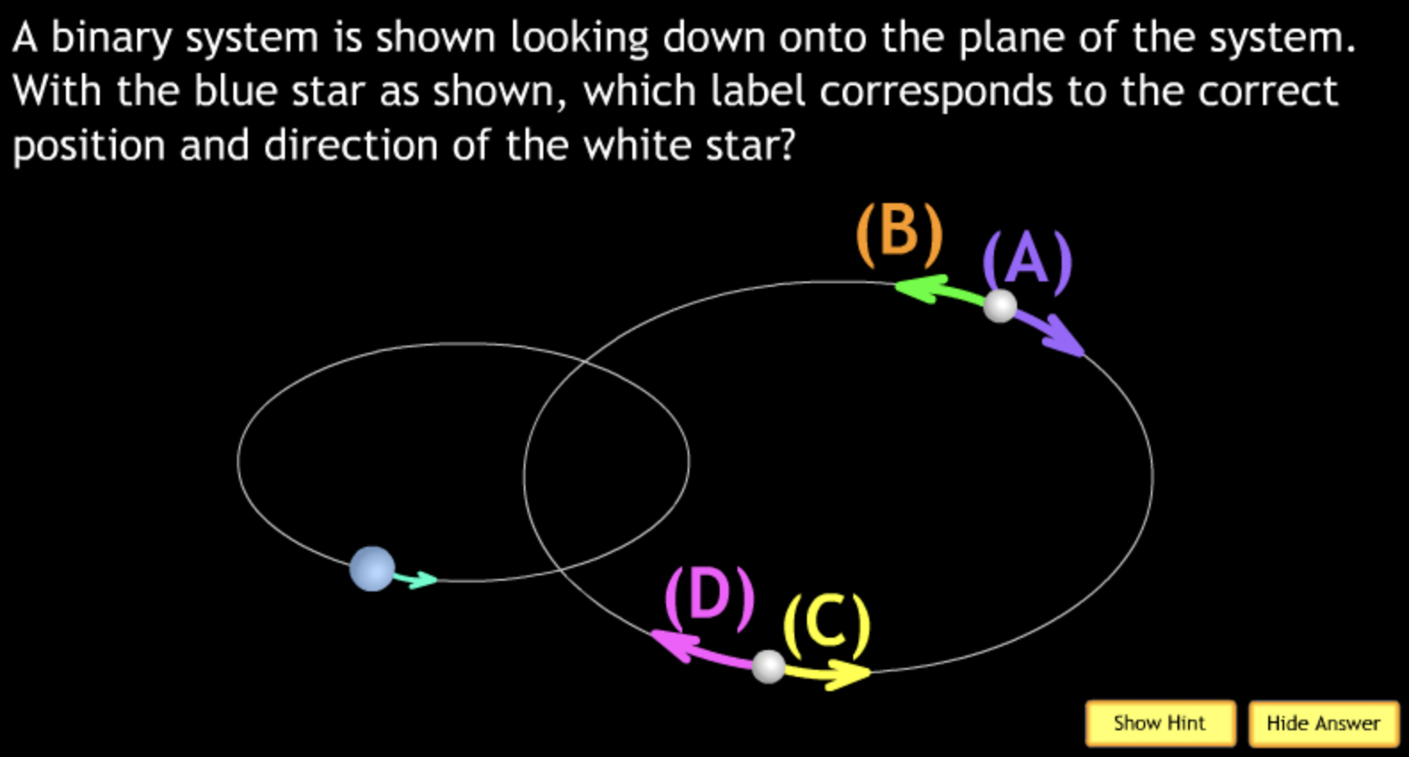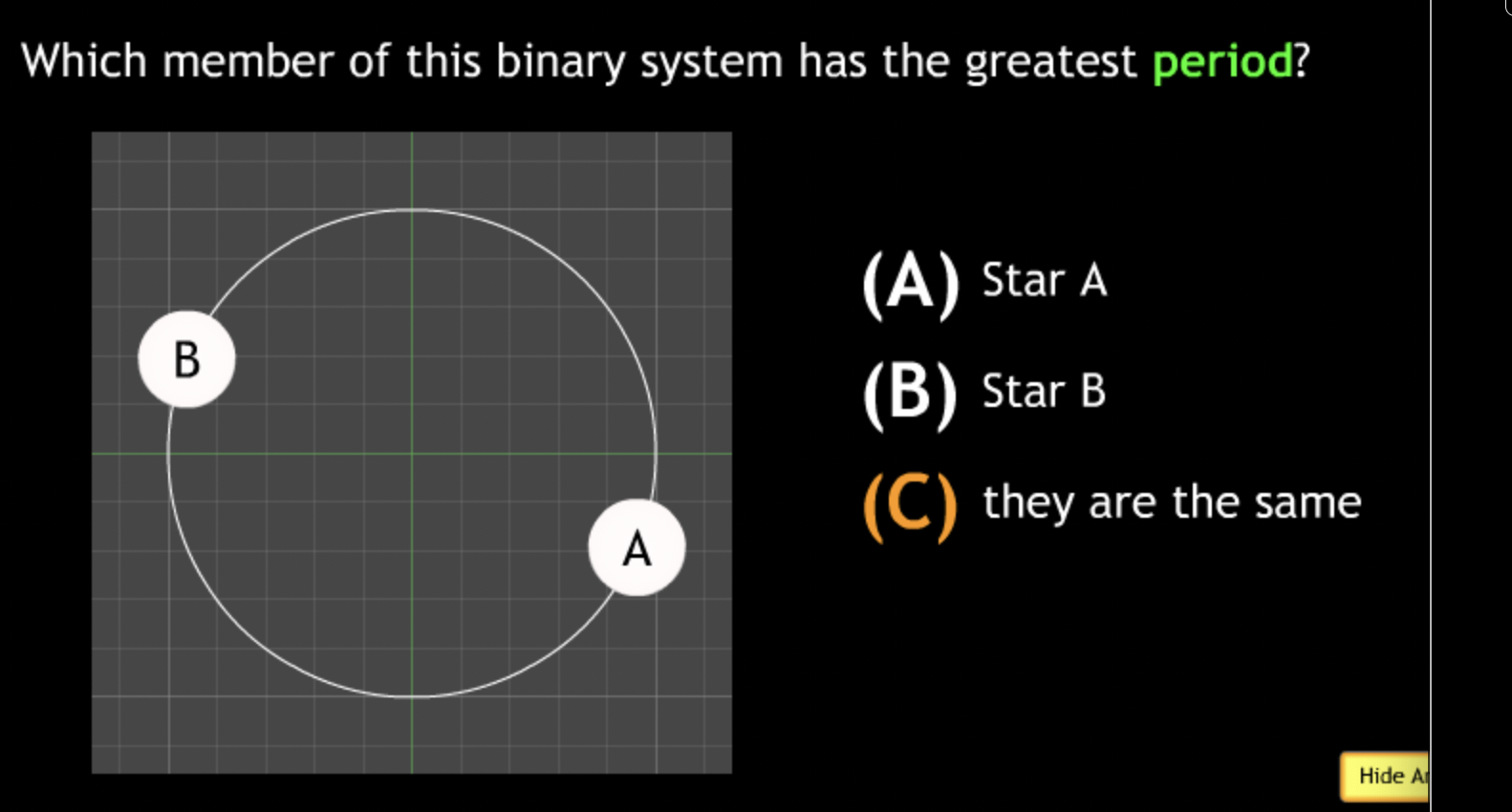 The center of mass in a binary star system is… on a line connecting the two stars. closer to the more massive star.