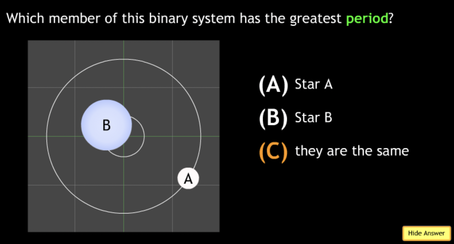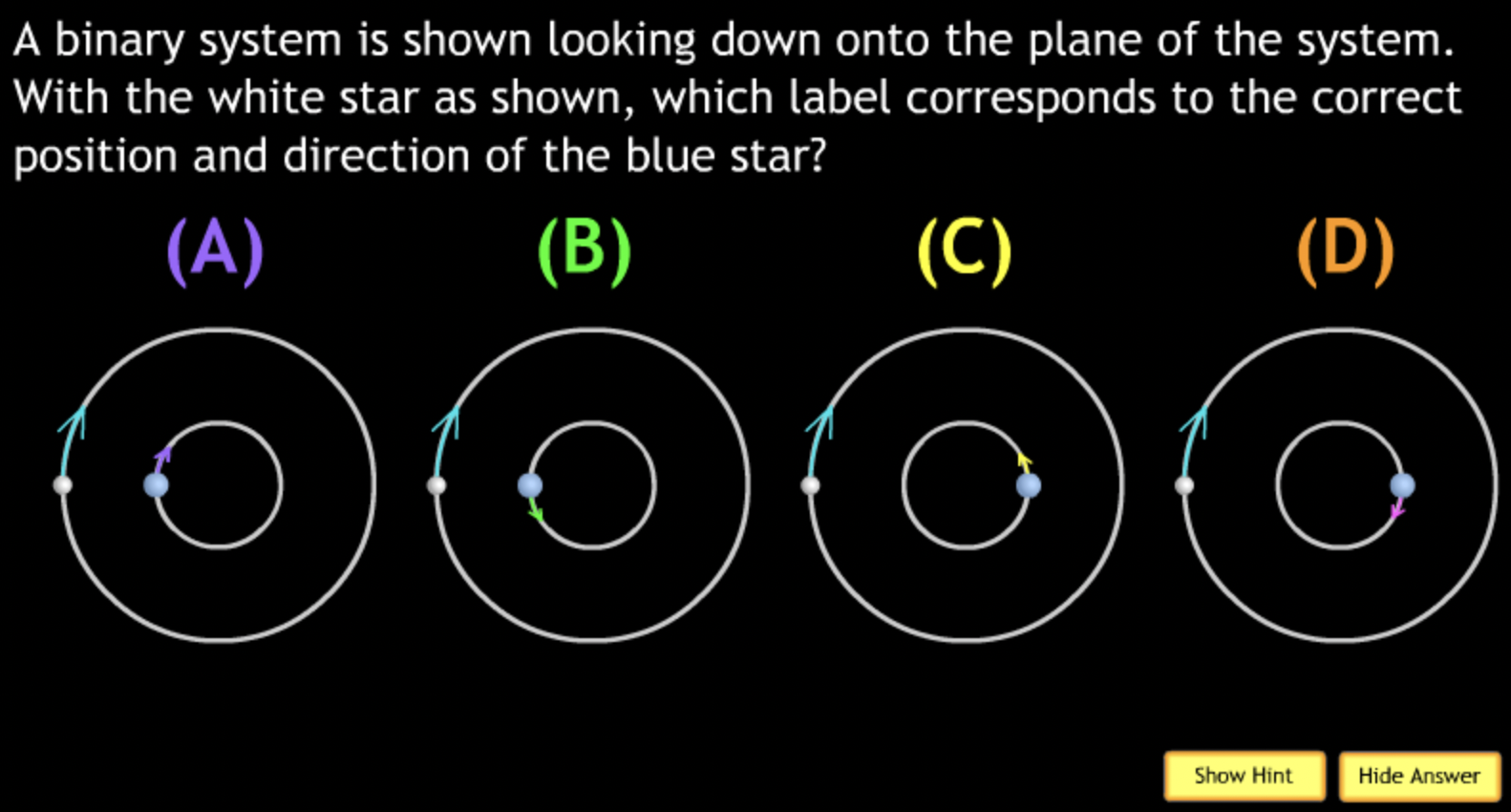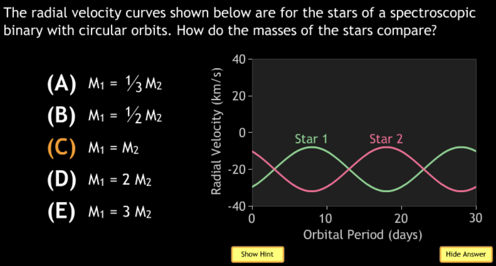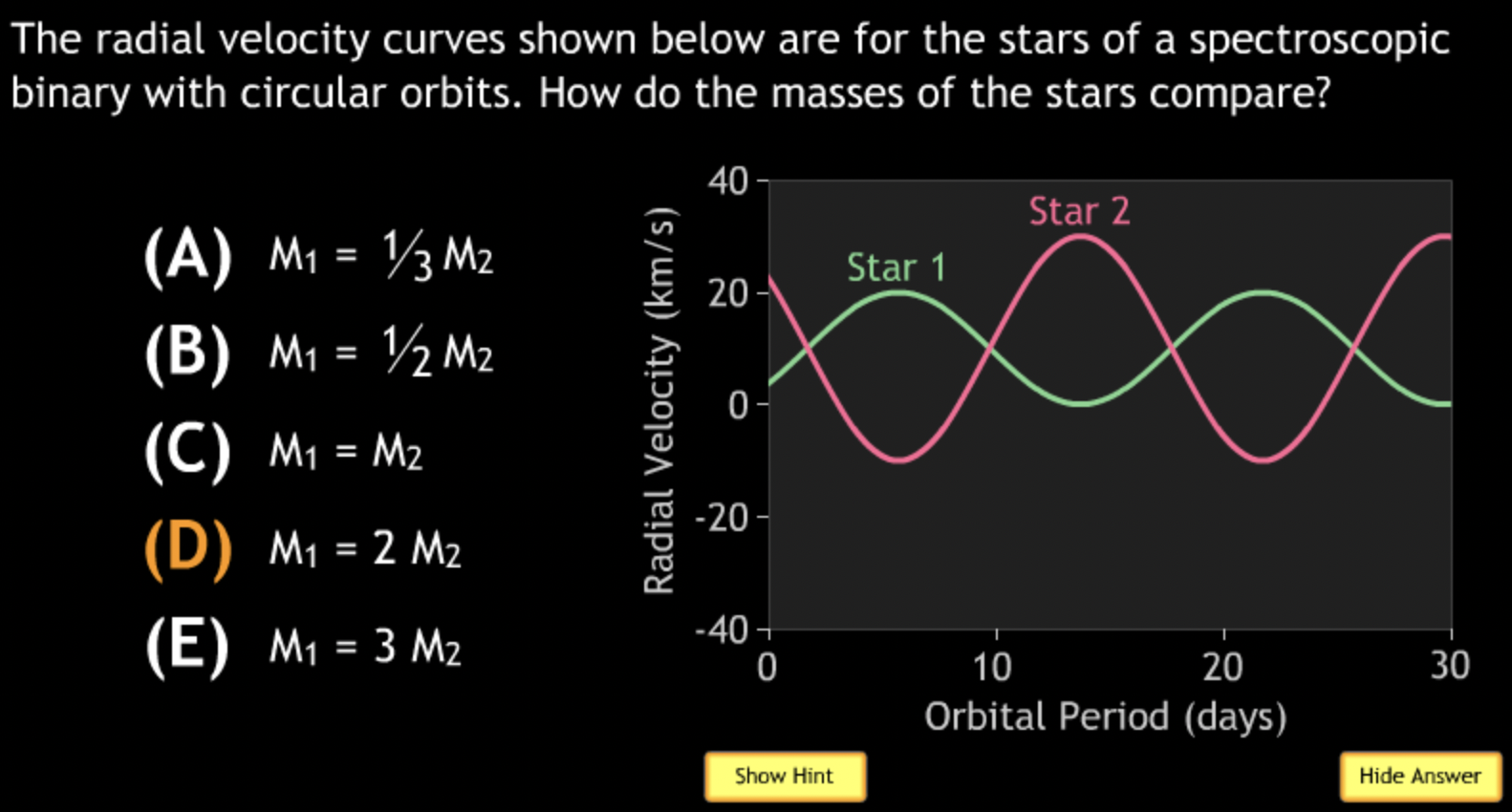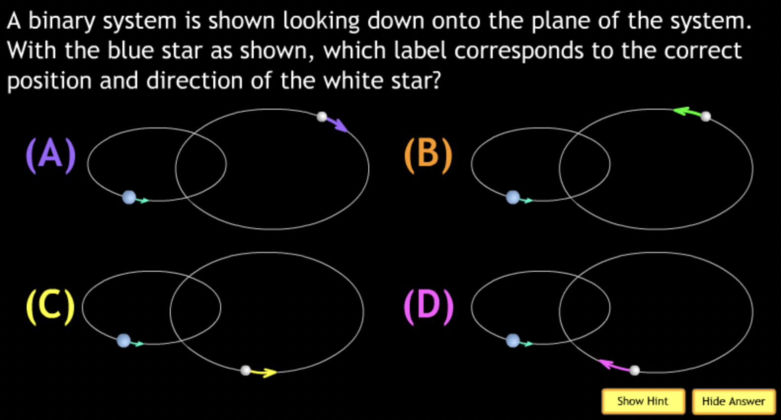 The center of mass in a binary star system is… on a line connecting the two stars. closer to the more massive star.