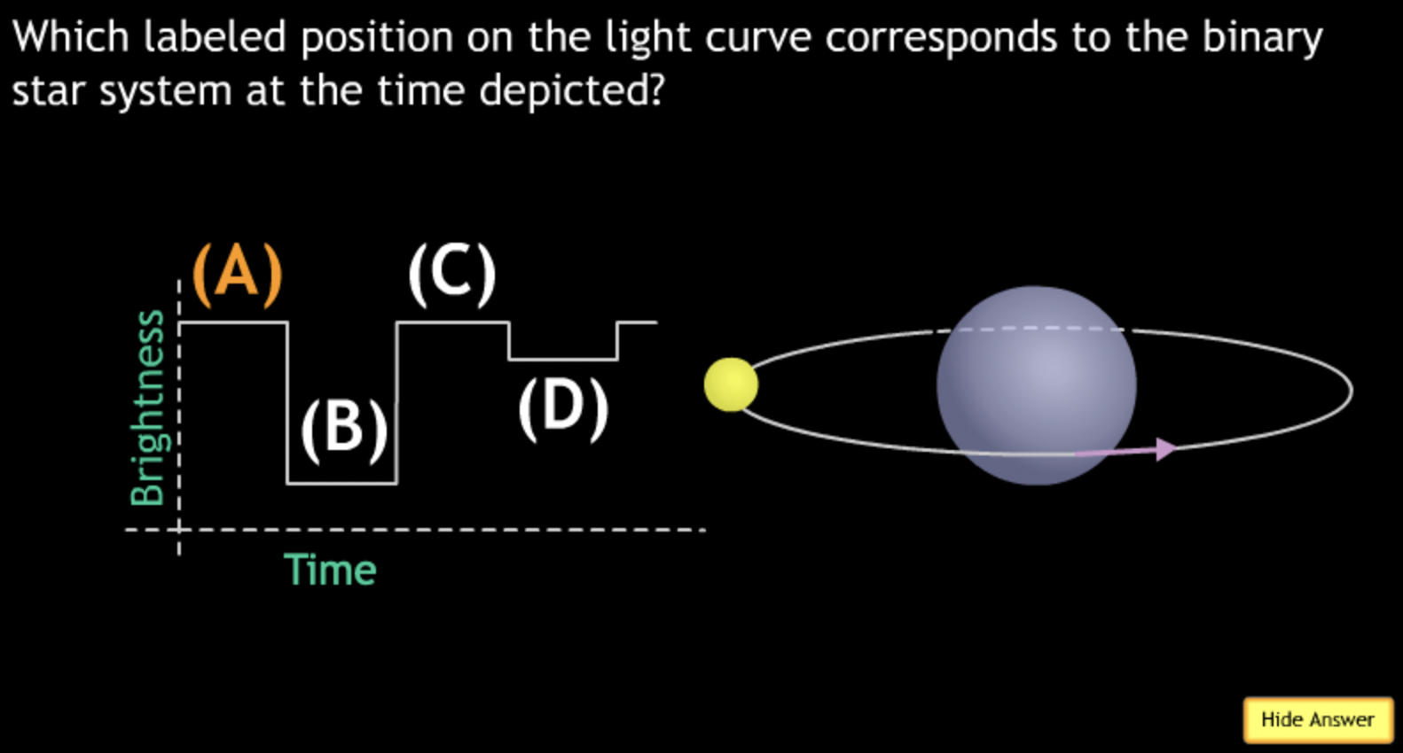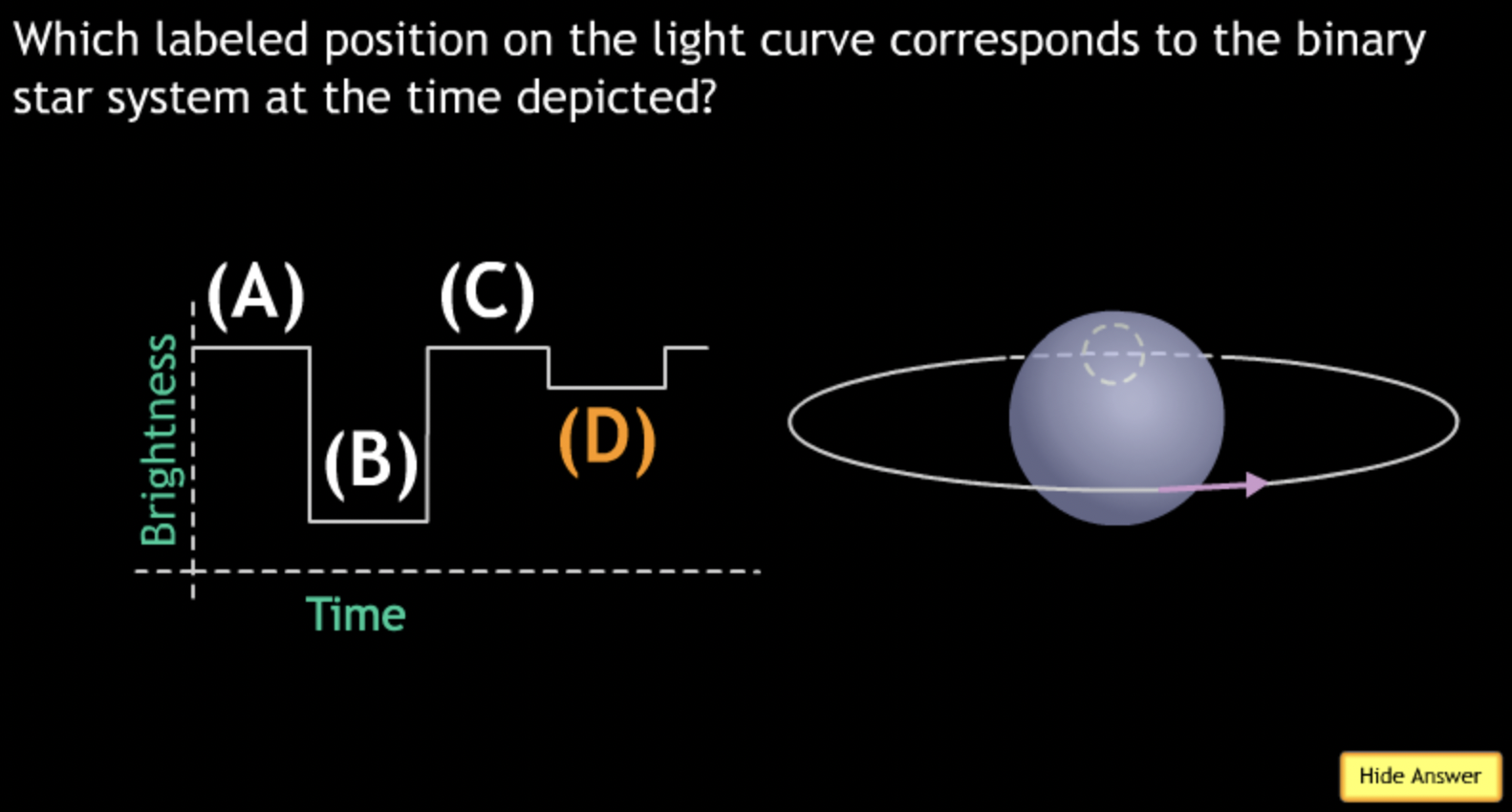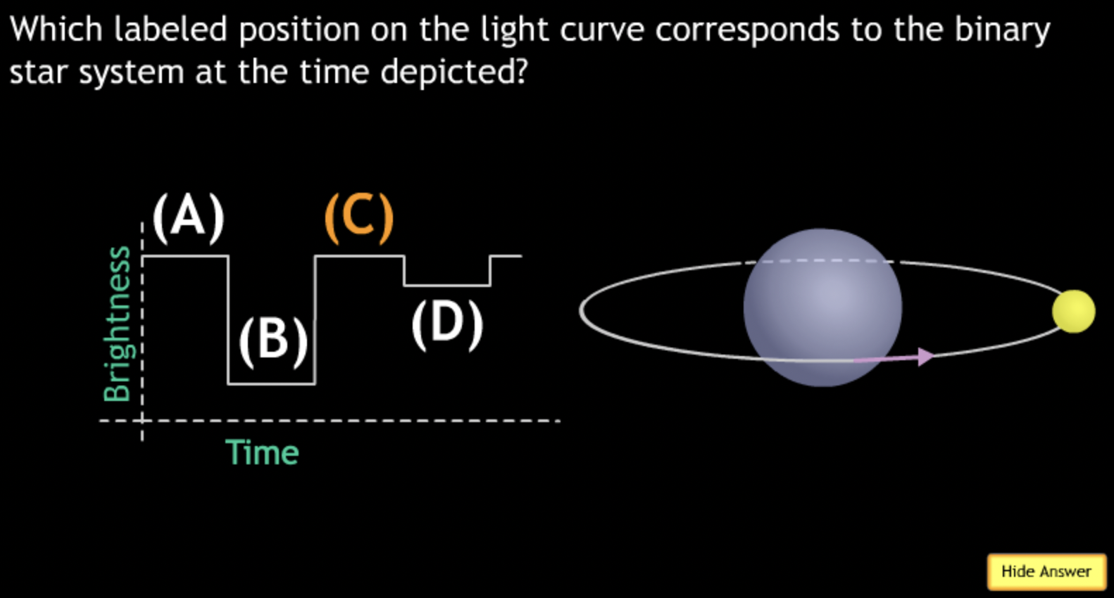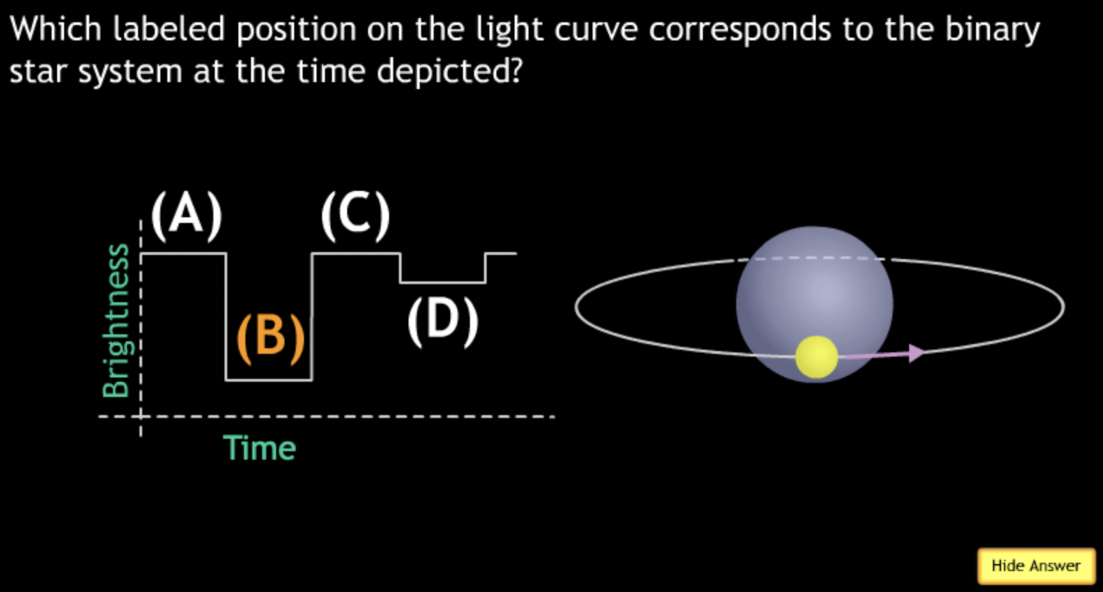 The center of mass in a binary star system is… on a line connecting the two stars. closer to the more massive star.