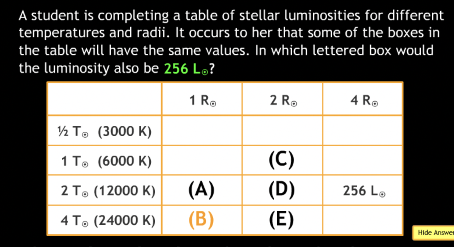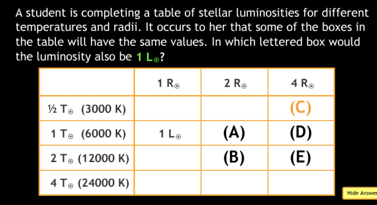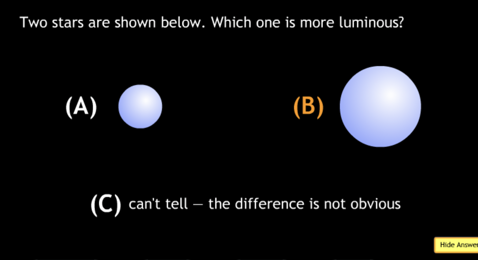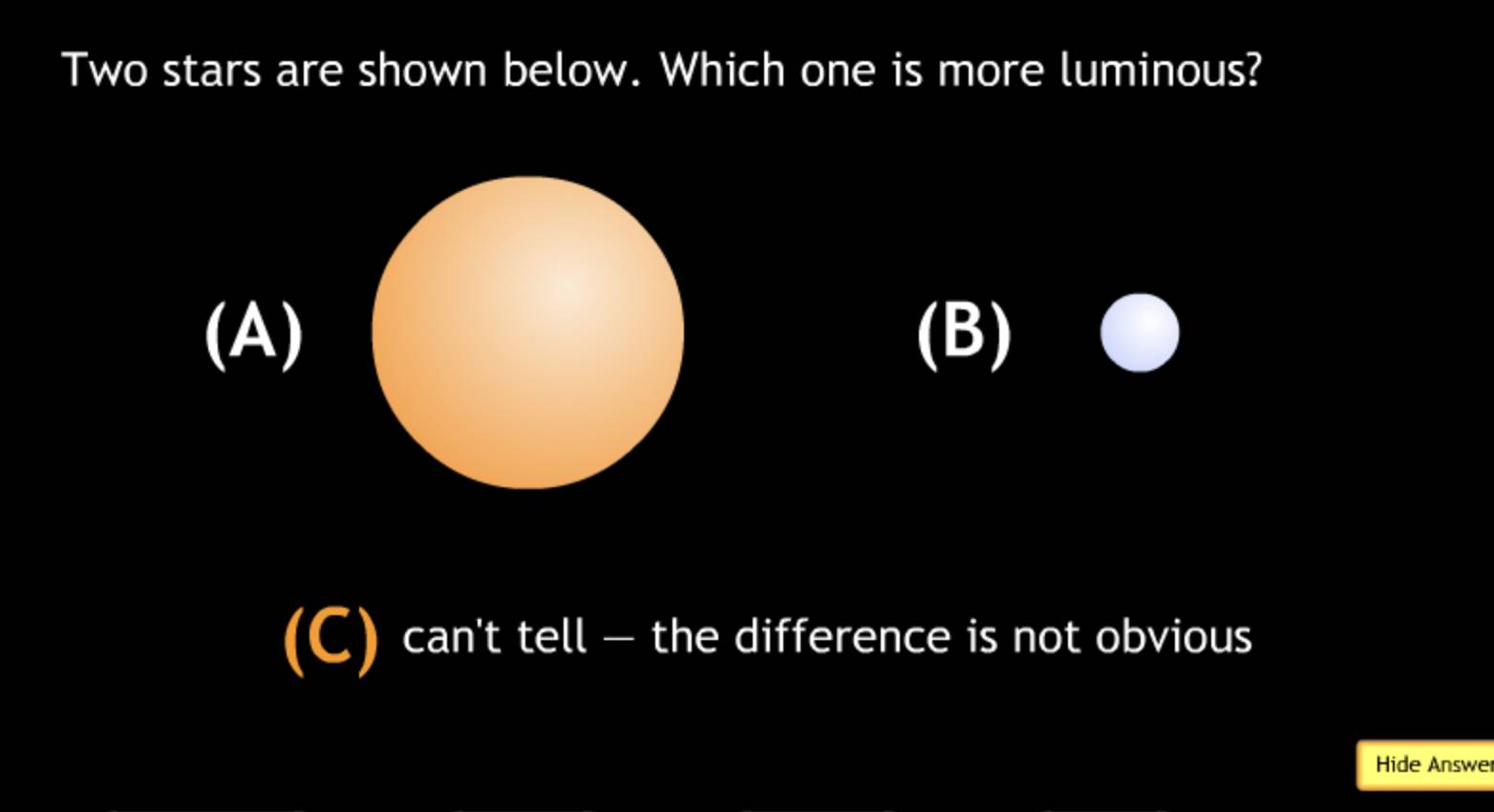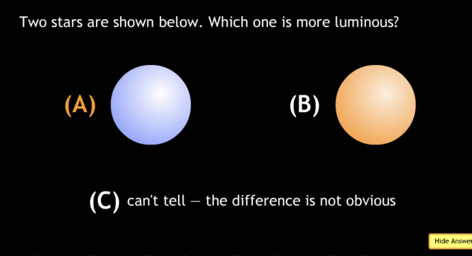 Two stars have the same luminosity. If star A has a hotter surface temperature than star B, then… star A is smaller