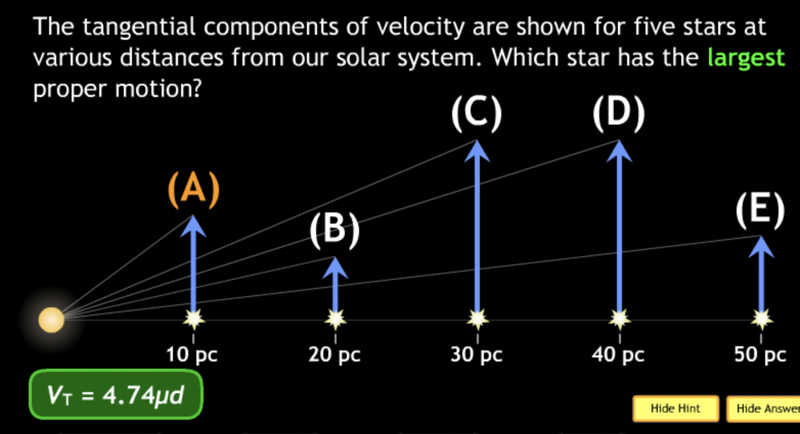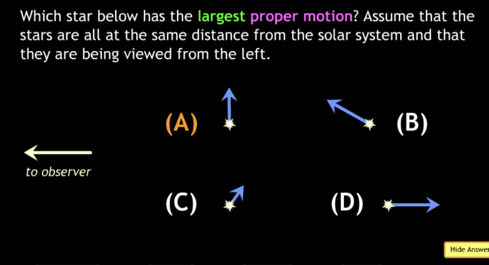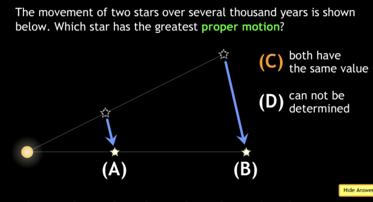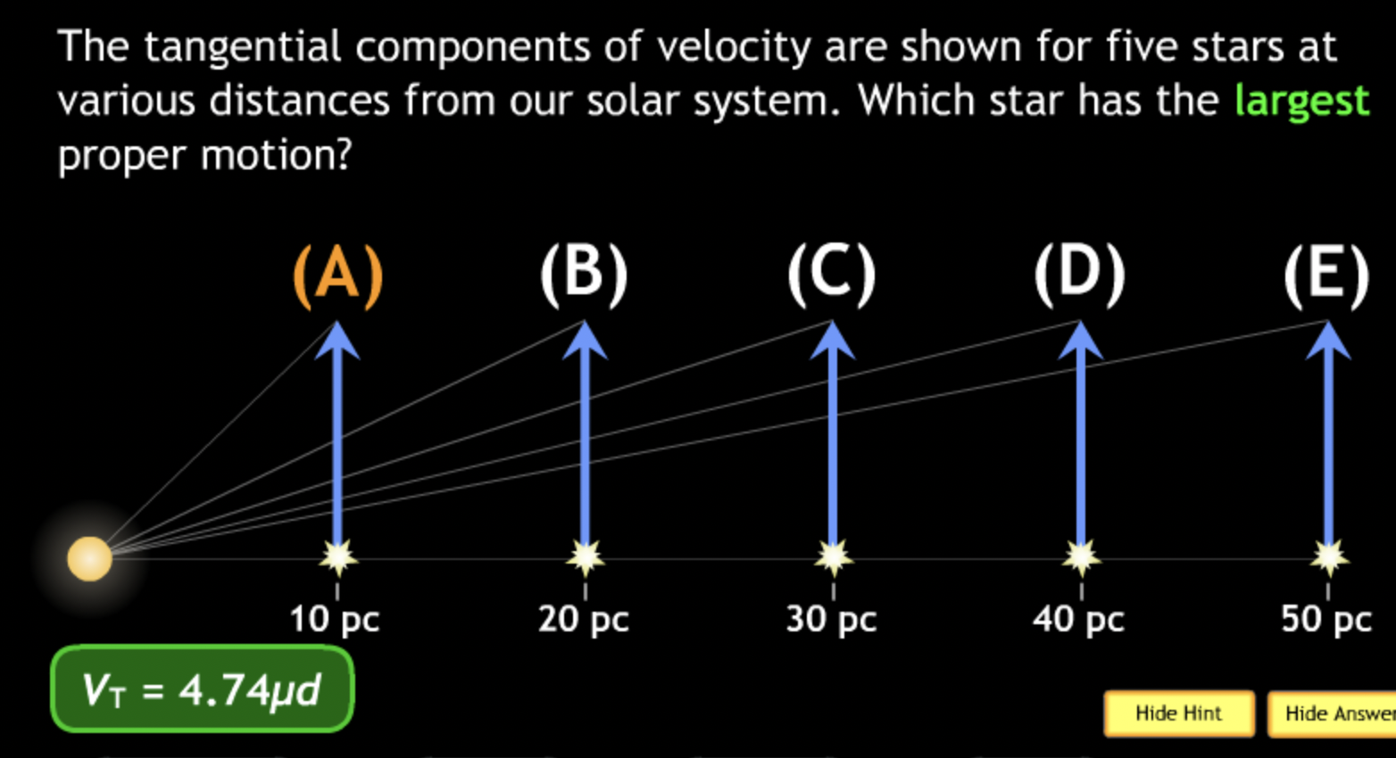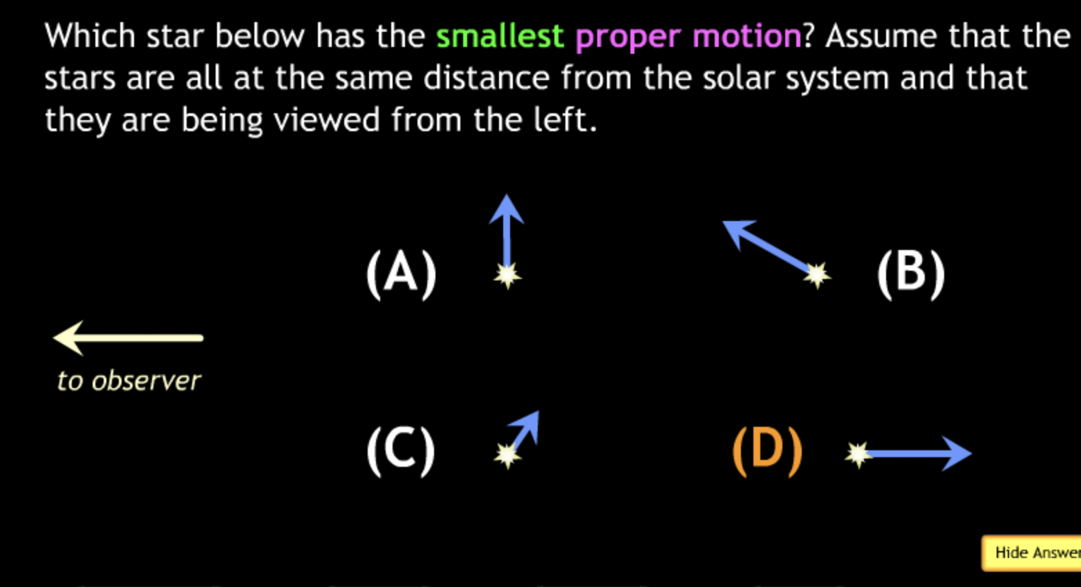 Barnard’s star has the largest proper motion of any star at 10.3 “/year. This large proper motion is (most logically) due to… the star being very close nearby