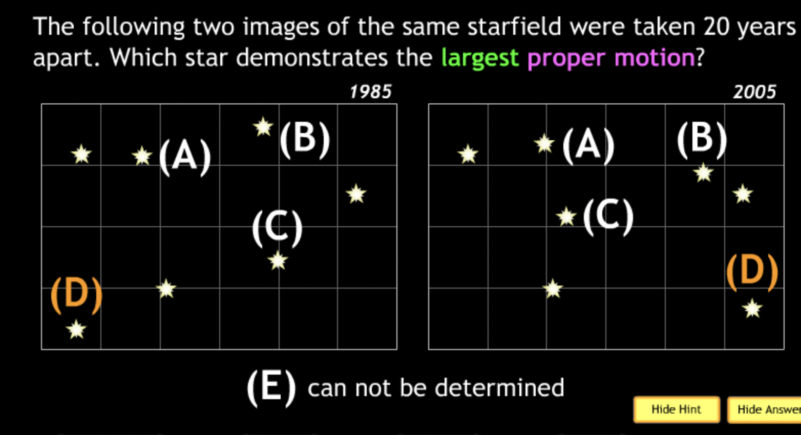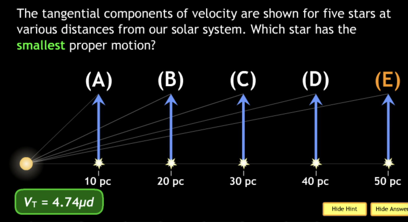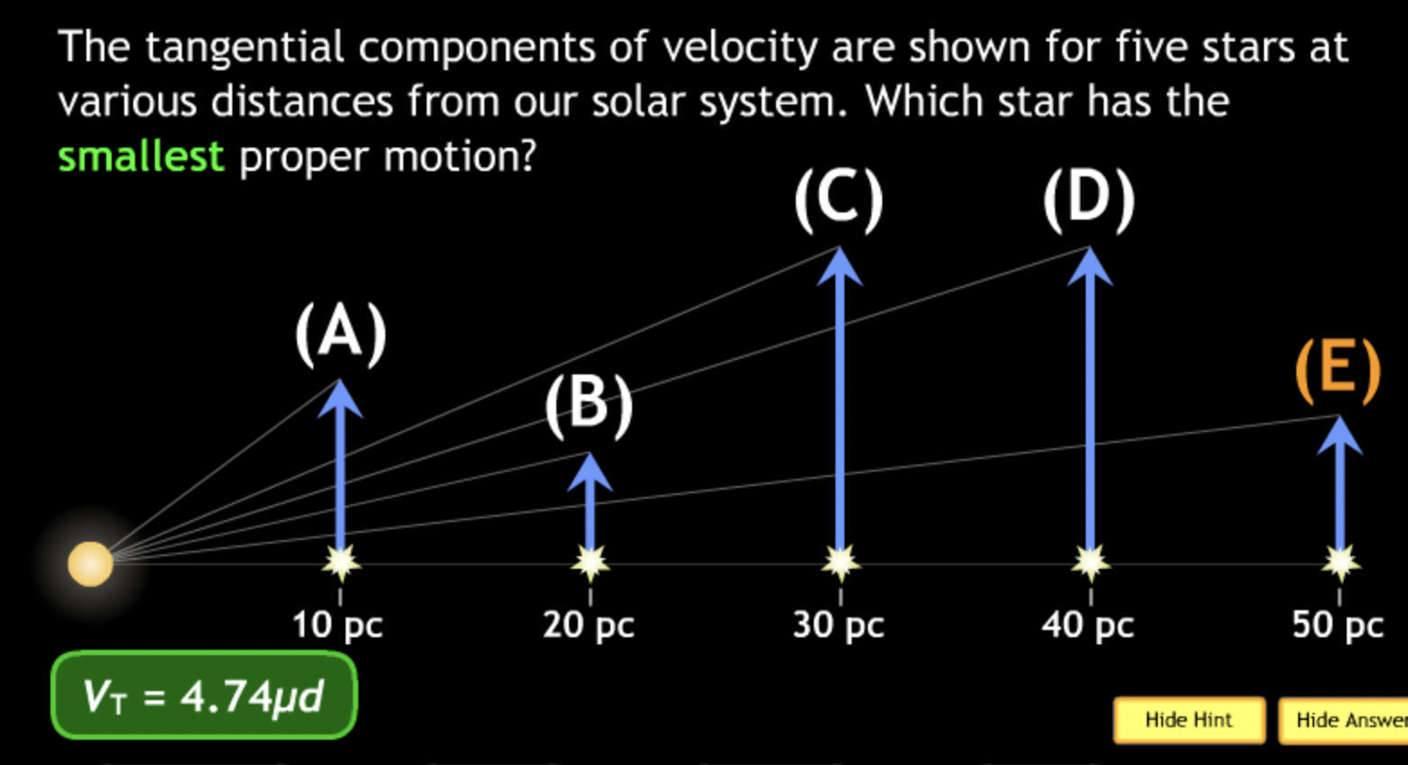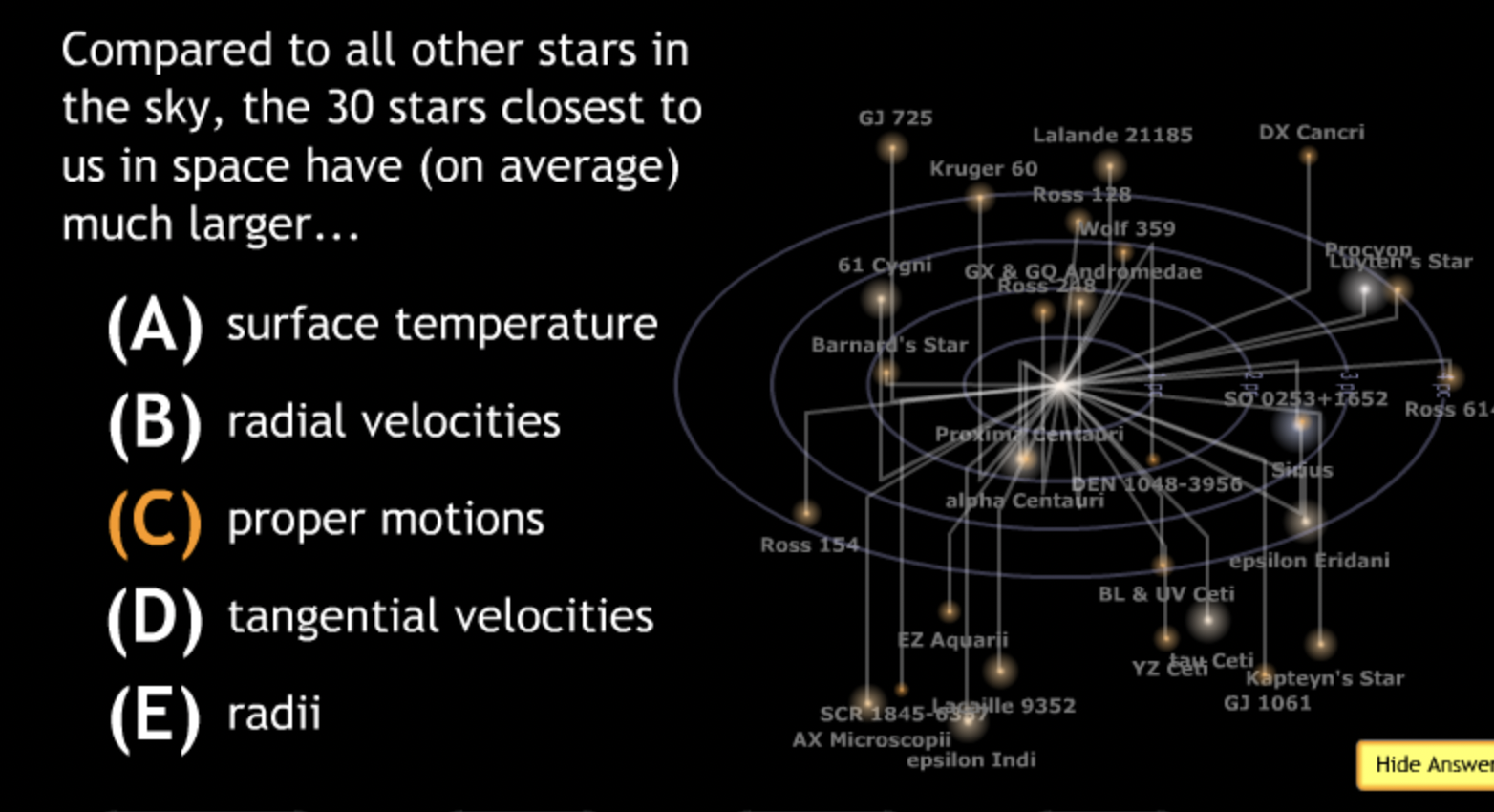 Barnard’s star has the largest proper motion of any star at 10.3 “/year. This large proper motion is (most logically) due to… the star being very close nearby