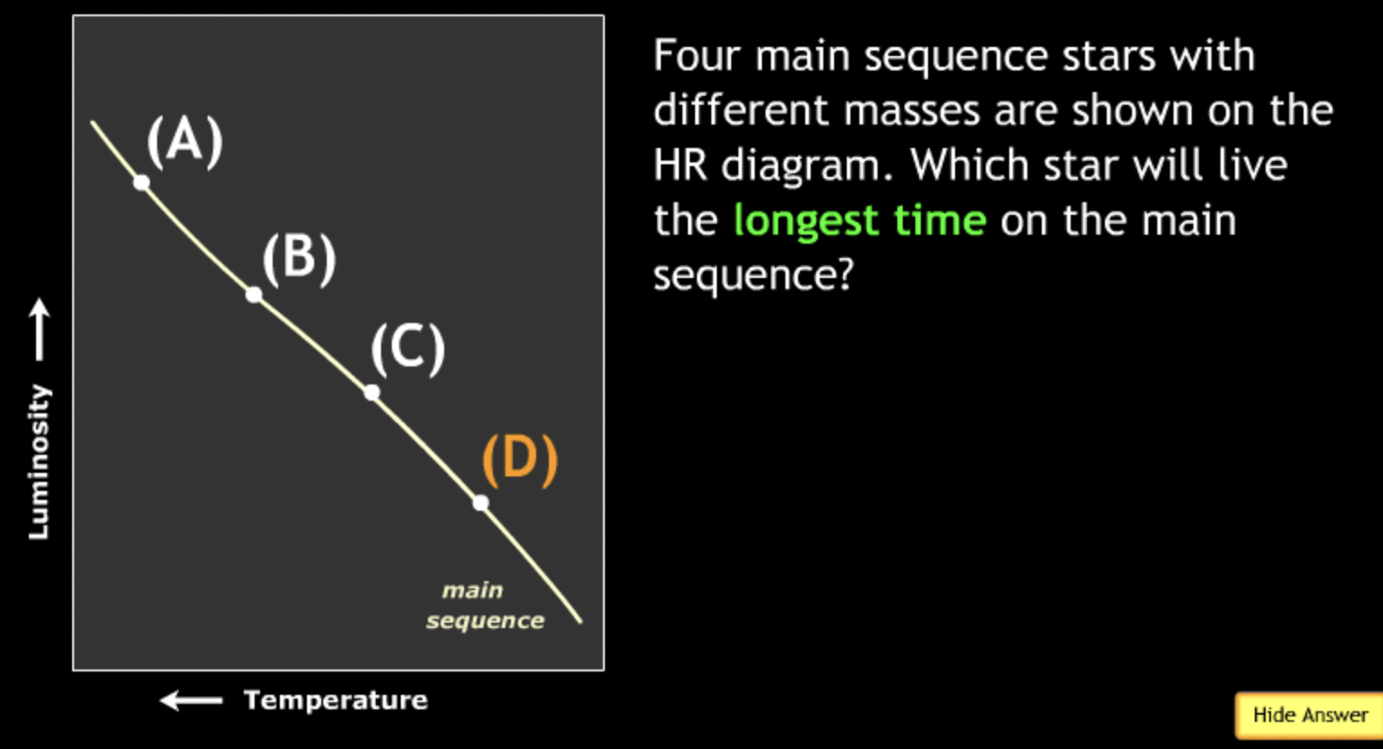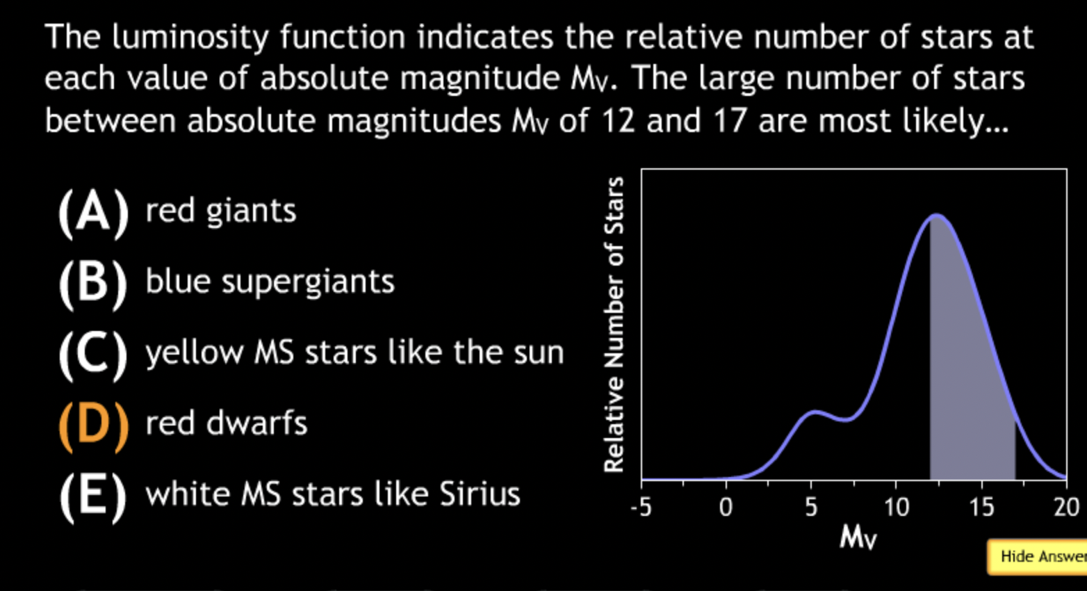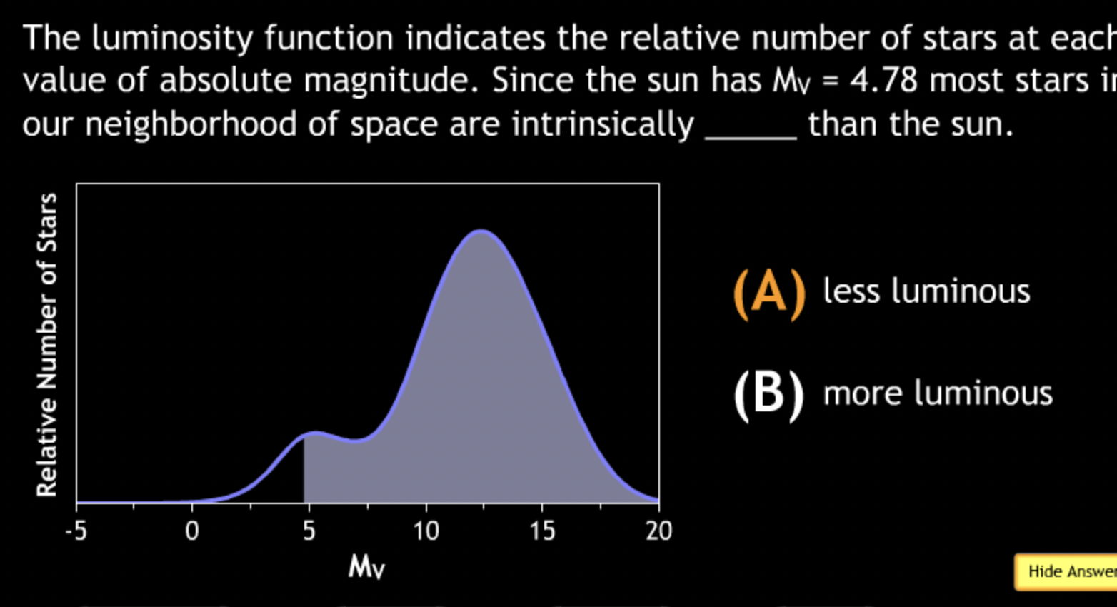 The most common stars are best described on the HR Diagram as… low luminosity, low temperature stars.