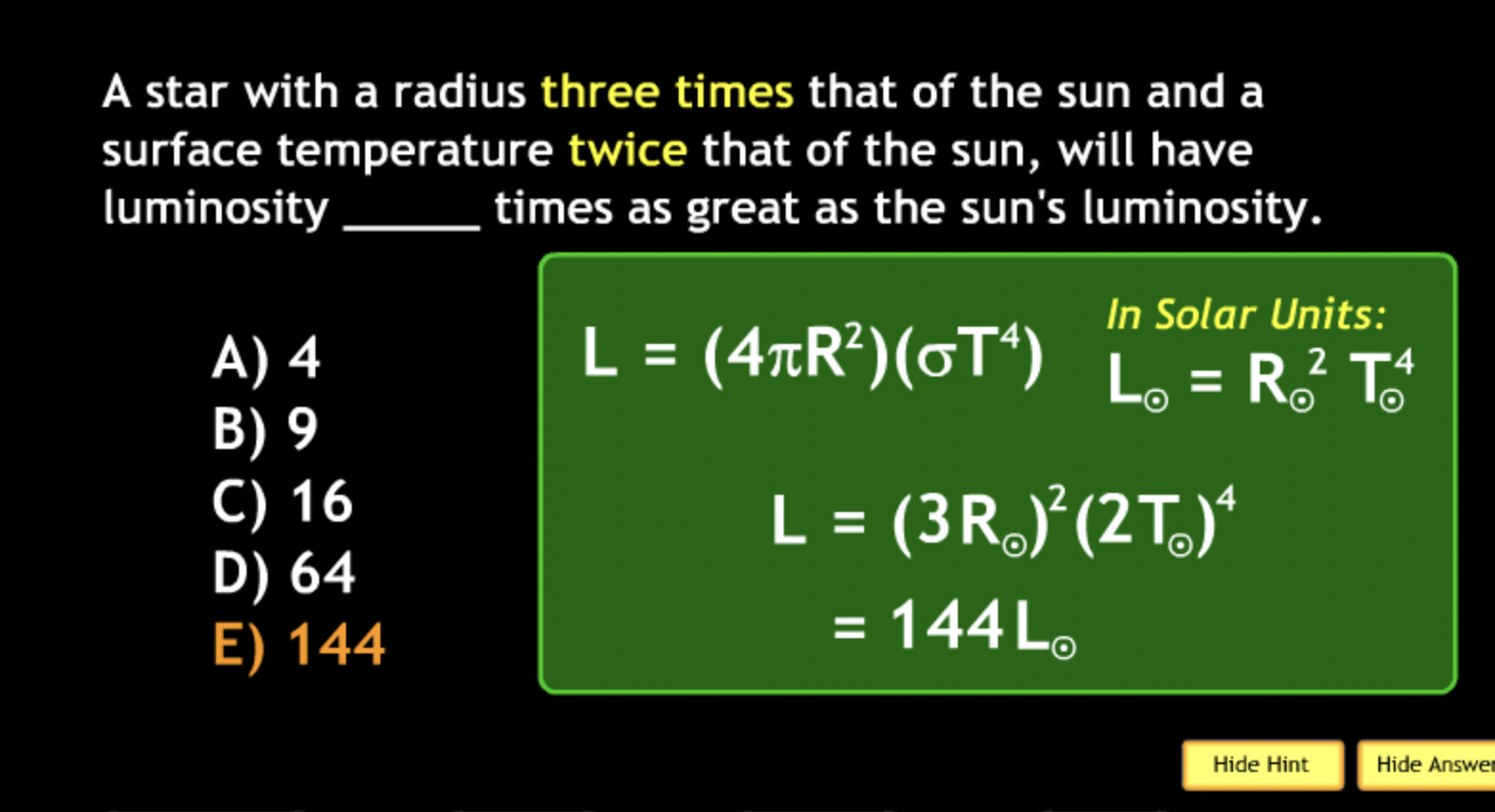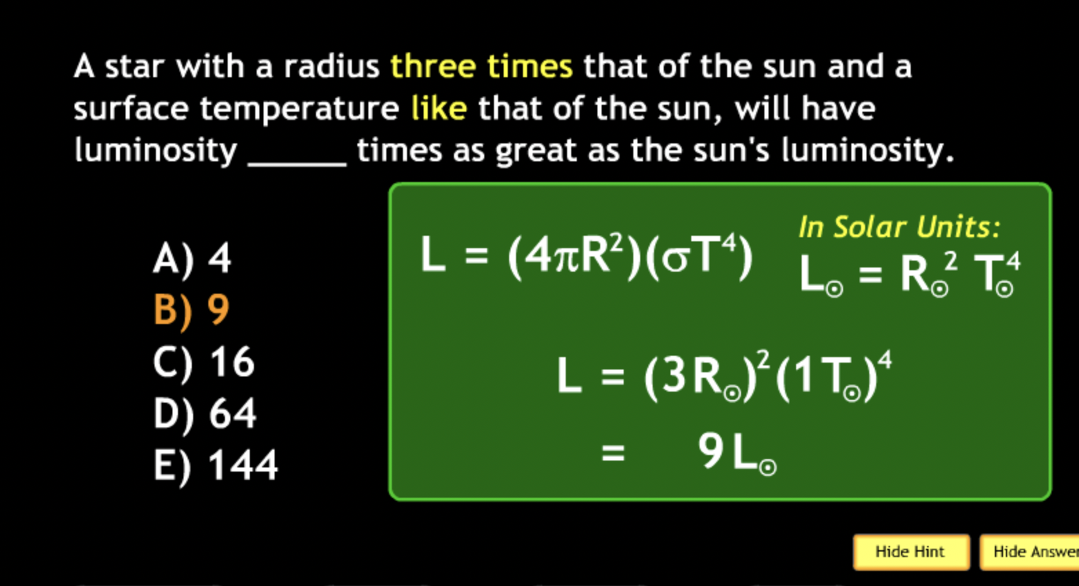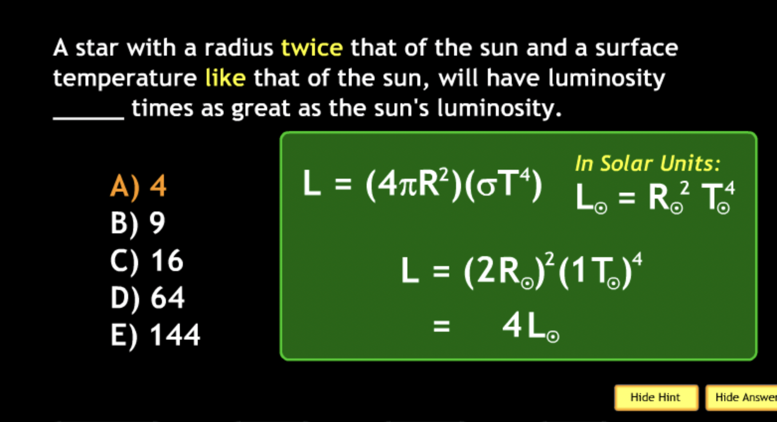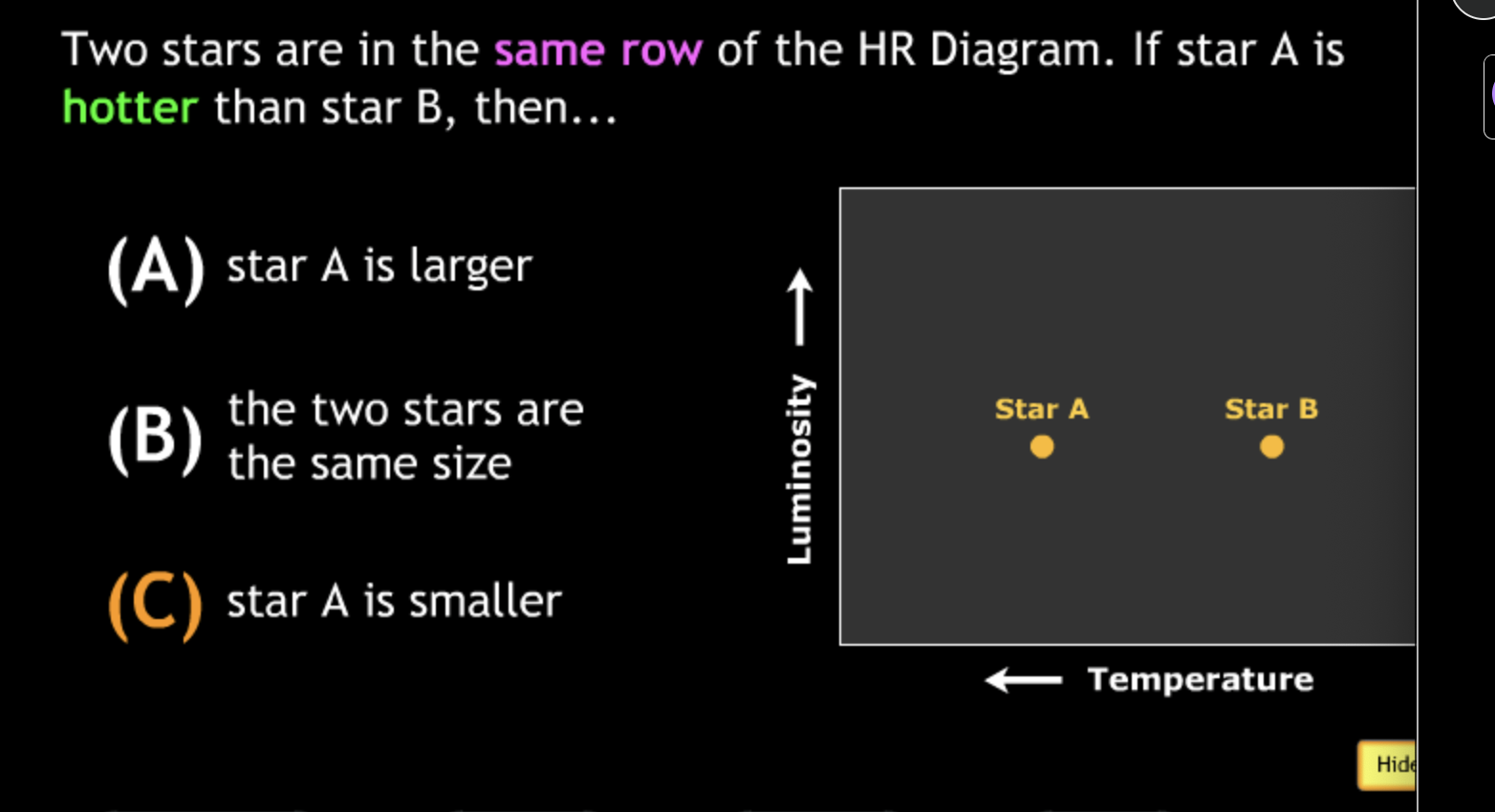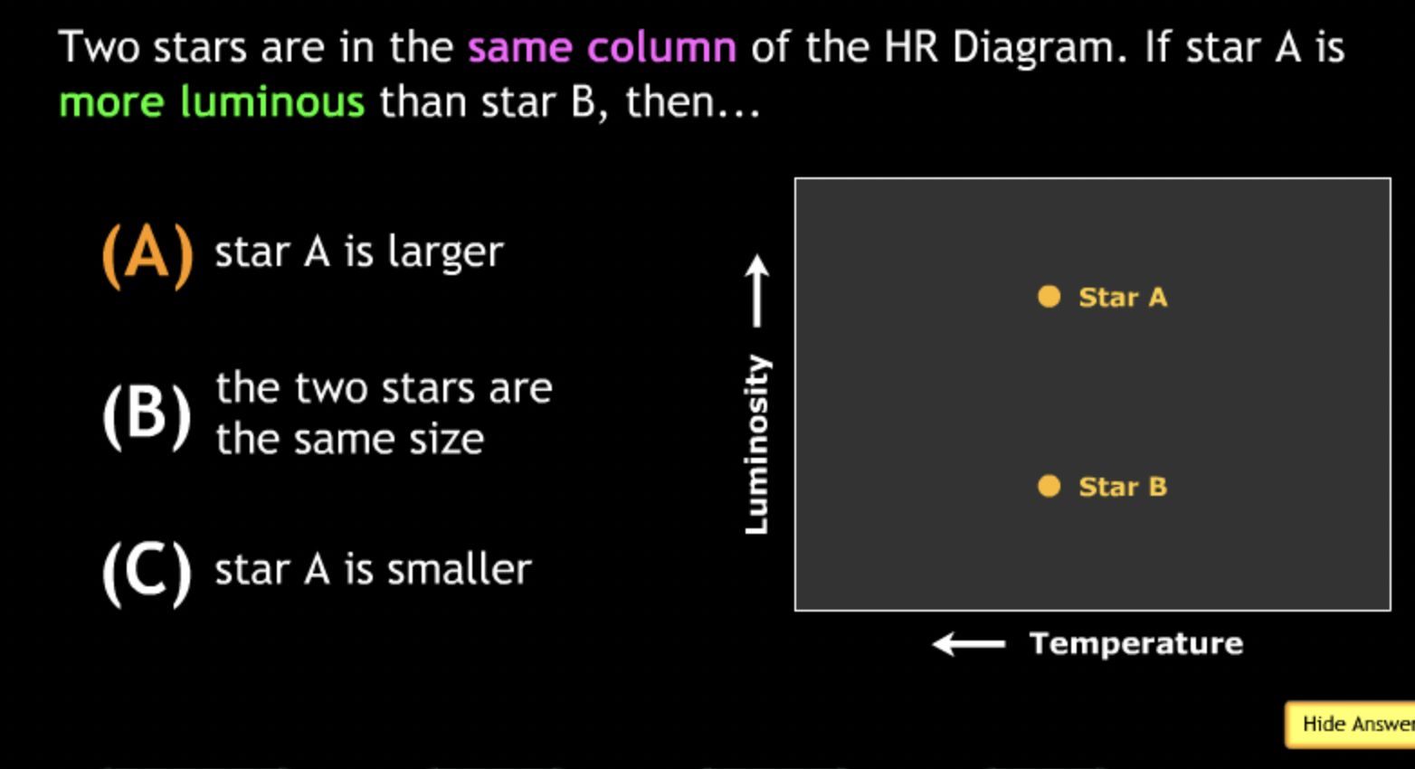 Two stars have the same surface temperature. If star A has a greater luminosity than star B, then… star A is larger