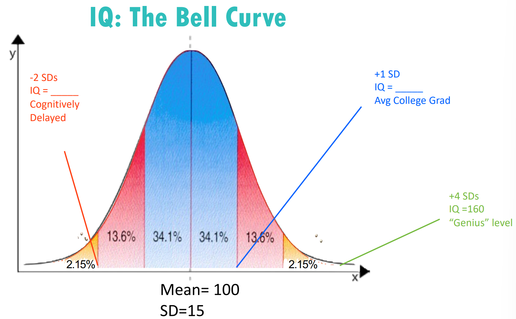 Intelligence quotient: originally developed to identify cognitive delays among children in school and became artificially constructed around a mean of 100 and a SD of 15