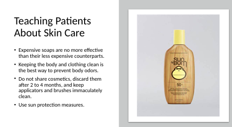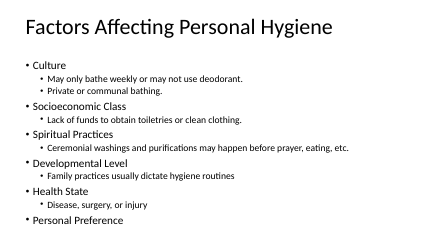It is important to identify cultural variations that could affect a patient’s personal hygiene preferences, such as typical bathing habits, and behaviors, such as use of various hygiene-related products (Andrews et al., 2020). For example, people from some cultures place a high value on personal cleanliness and feel unclean unless they shower or bathe at least once daily. Many consider bathing incomplete without the use of products to reduce or mask normal body odors. Other people often find a weekly bath sufficient and may feel no need to mask normal body odors. Culture may also influence whether bathing is a private or communal activity.