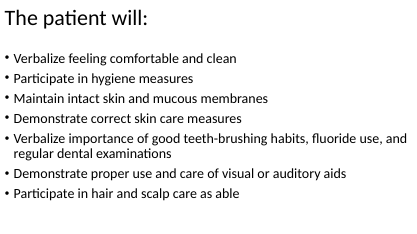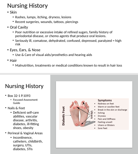 The comprehensive nursing assessment uses interview and assessment skills to elicit data about the patient’s hygiene status. When alterations in a patient’s physical or mental health result in impaired ability to maintain acceptable personal hygiene, additional specific assessment skills are needed to determine the patient’s limitations.