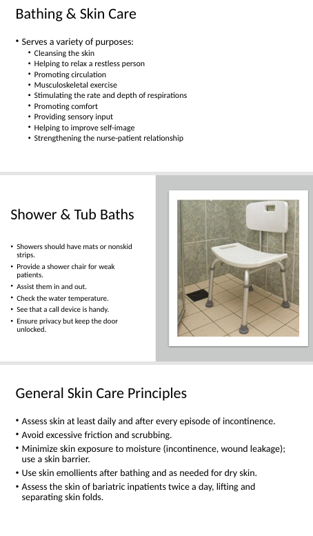6. Bathe and cleanse skin regularly. Apply lotion or cream to dry skin, as necessary. Cleanse the axilla and perineal area thoroughly and apply deodorant or antiperspirant as needed.
