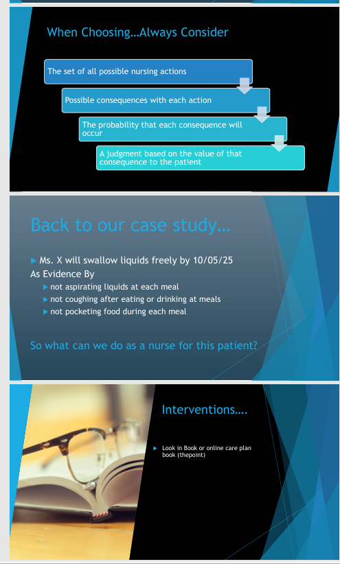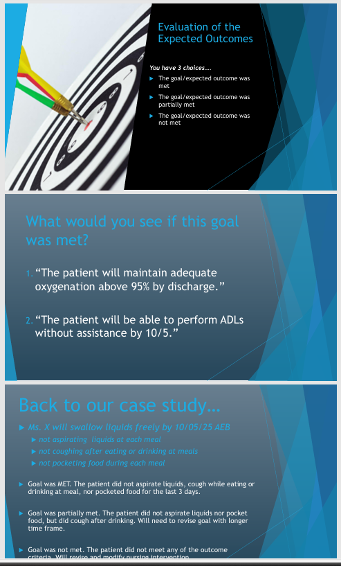 Outcome: swallow liquids freely by Sunday; evidenced by no aspiration and no coughing; if coughing persists or pocketing occurs, revise goal or extend time frame