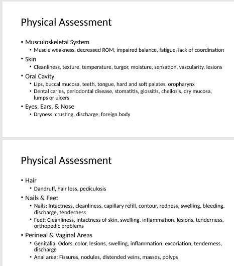 2.Assess the adequacy of hygiene practices and self-care behaviors using appropriate interview and physical assessment skills.