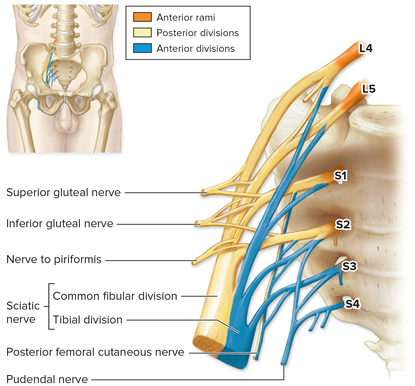 The sacral part of the spinal cord lies inferior to the lumbar part and contains the neurons for the sacral spinal nerves.