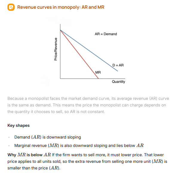 Monopoly = AR = D and MR lies below AR