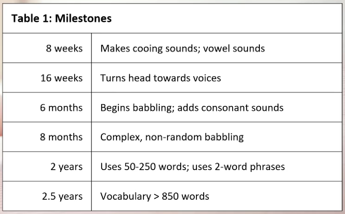 babbling :: sounds using combo of vowels and consonants; combinations slowily become real words