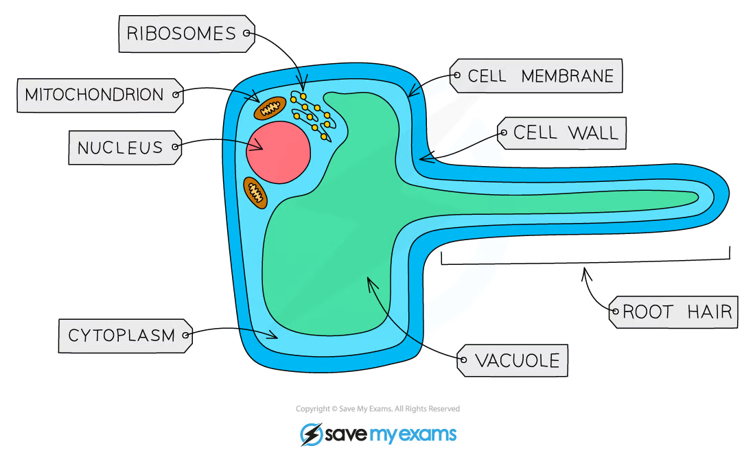 root hair cells have a fine extension that extends out into the soil, this provides a large surface area for absorption of water and mineral ions