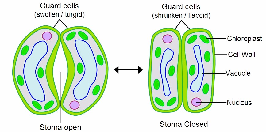 Turgid/Open = less flexible + thicker, H20 enters by osmosis causing vacuoles to expand