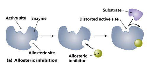 In allosteric inhibition, the active site ==changes shape== when an inhibitor ==binds to an allosteric site==
