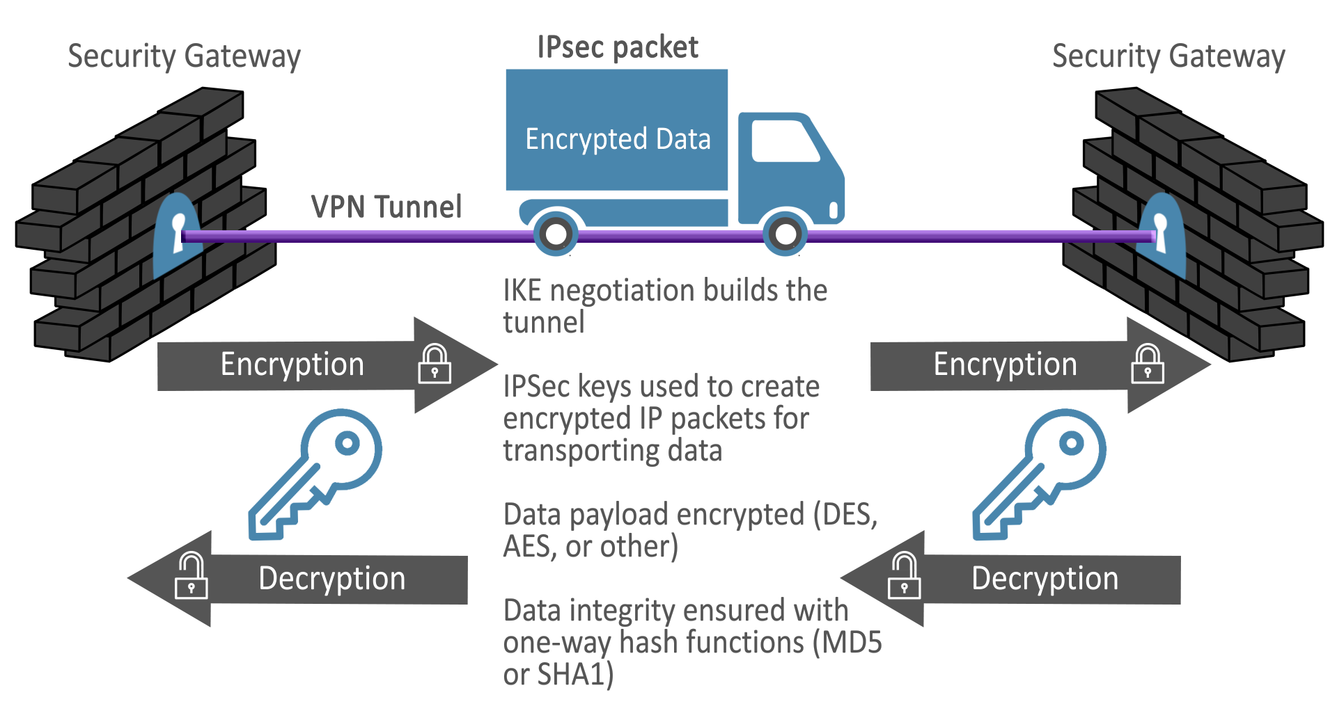 IPsec traffic is encapsulated and authenticated, which allows the devices to create an encrypted tunnel that traffic may pass through. This encapsulation hides the fact that the packets are flowing across an untrusted network, such as the internet, and gives the client computers the illusion that they are directly connected to one another or at least within the same network.