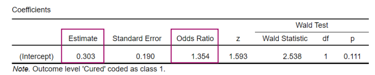 ^odds(cured) = eb0 = e0.303 (e to the estimate power) = 1.354 (odds ratio)
