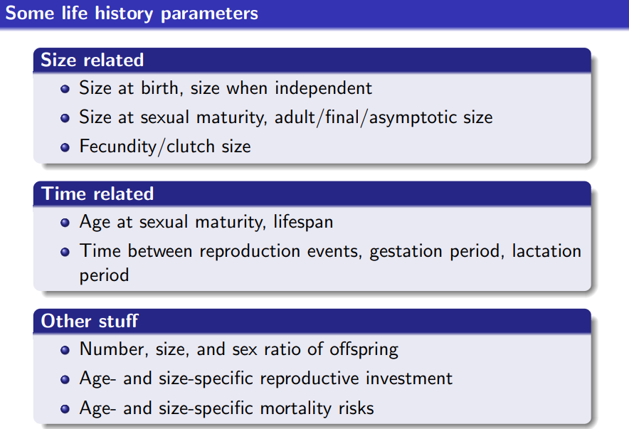 Life history: The major features of the life cycle through which an organism passes, with particular emphasis on survival and reproduction. Features notably include but are not limited to sexual maturity, first reproduction, number of offspring and level of parental investment, and timing of senescence and death.