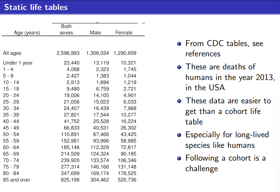 Can get approximate survival curve from static life table if population is stable and there is a stable age distribution (not often the case in practice)