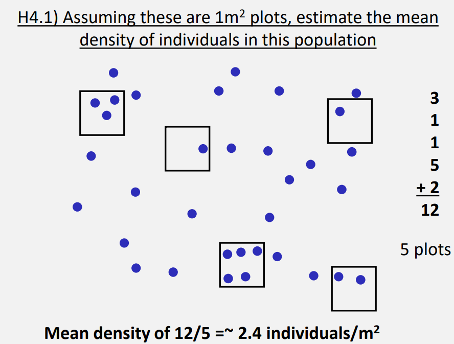 -Fixed Area Sampling (Quadrat sampling) – A random sample of 1% of the total area can often provide accurate estimates of density (as long as quadrats are distributed randomly)