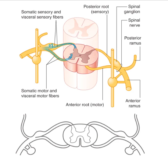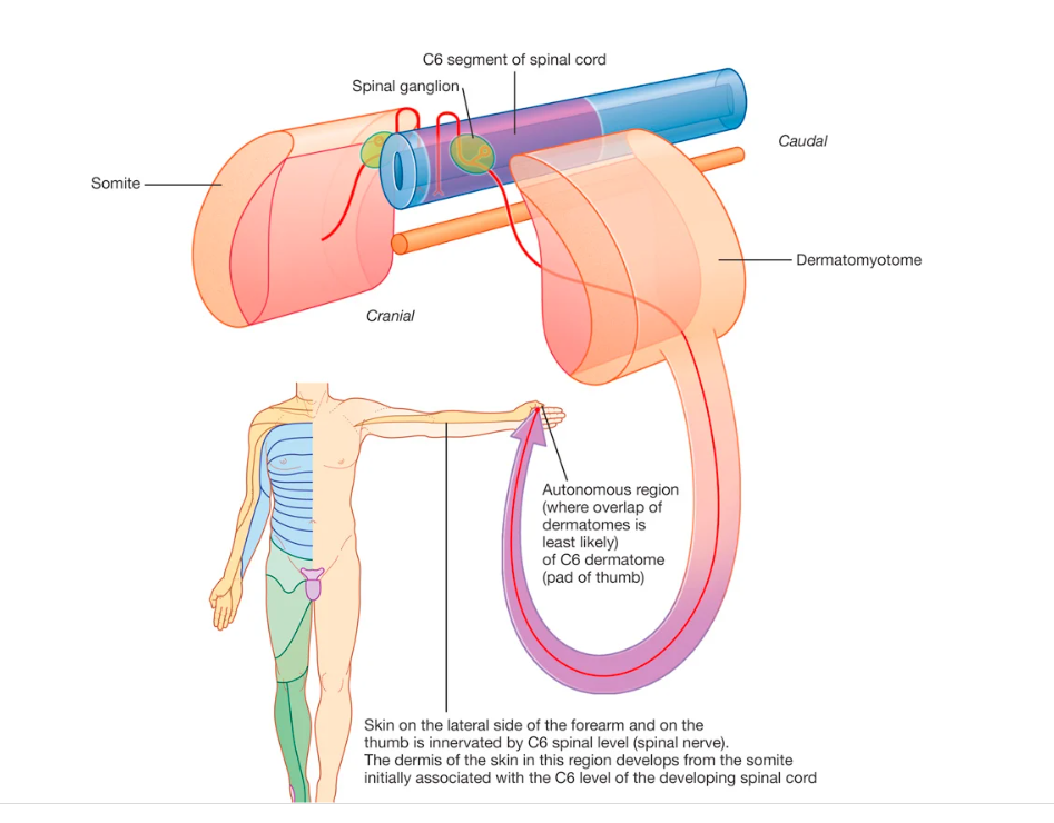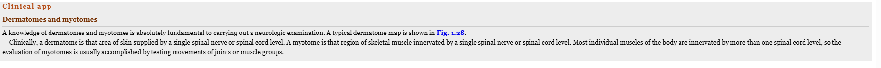 Because cells from a specific somite develop into the dermis of the skin in a precise location, somatic sensory fibers originally associated with that somite enter the posterior region of the spinal cord at a specific level and become part of one specific spinal nerve (Fig. 1.26). Each spinal nerve therefore carries somatic sensory information from a specific area of skin on the surface of the body. A dermatome is that area of skin supplied by a single spinal cord level or, on one side, by a single spinal nerve.