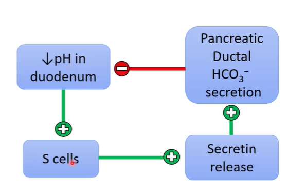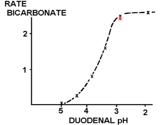 Bicarbonate secretion stops when pH is still acidic → main reason is because there are other things that can also help e.g bile and brunners glands secrete alkaline fluds