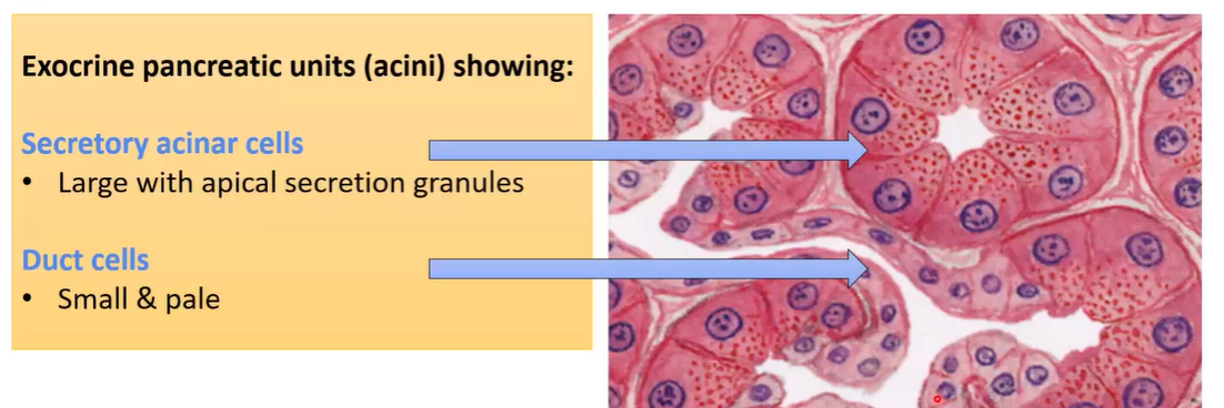Secretory acinar cells - large with apical secretion granules