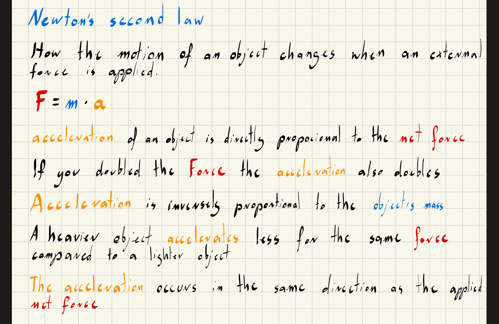 💡 "The acceleration of an object is directly proportional to the net force acting on it and inversely proportional to its mass."