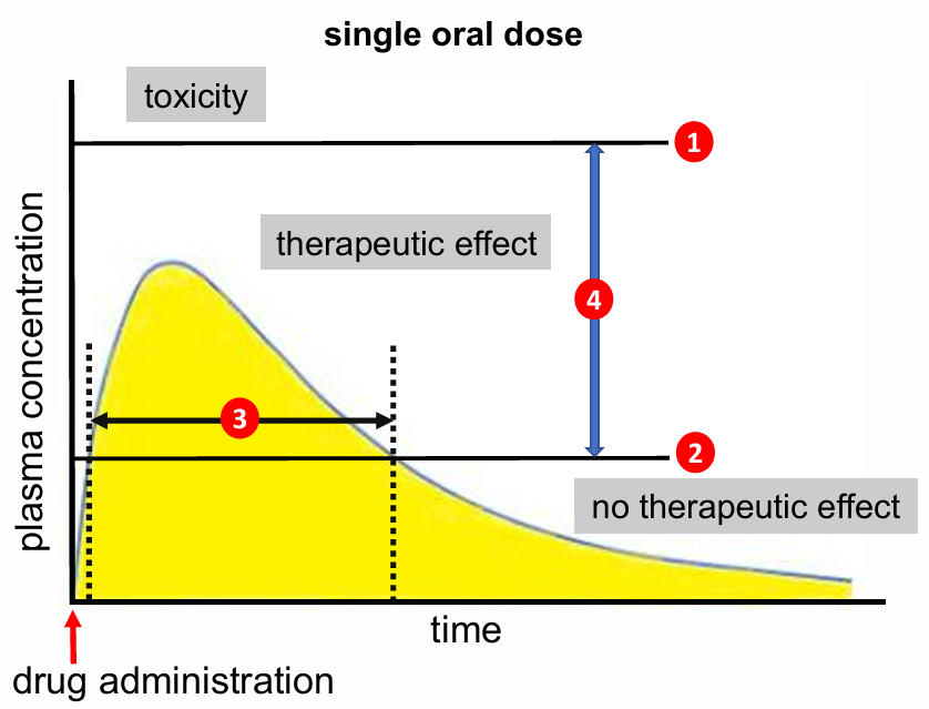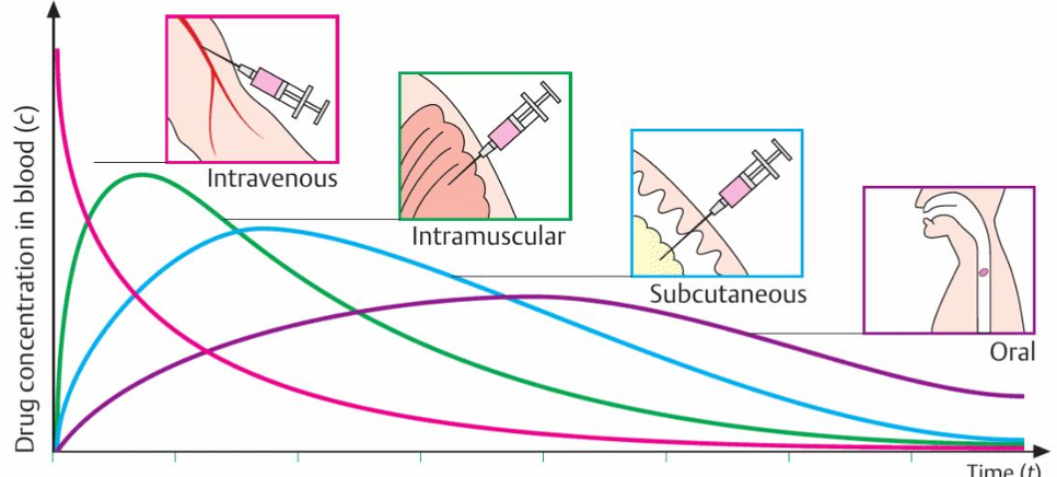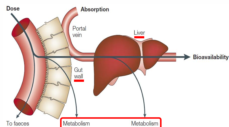 Oral drugs: affected by absorption and first-pass metabolism (what is left after gut wall and liver).