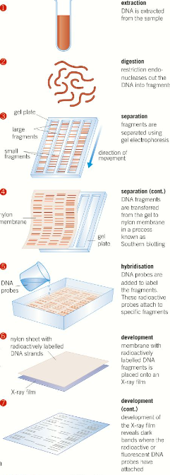 The cut fragments of DNA need to be separated to form a clear and recognisable pattern, this is done using electrophoresis, which is a technique that utilises the way charged particles move through a gel medium under the influence of an electric current. The gel is then immersed in alkali in order to separate the DNA double strands into single strands. The single-stranded DNA fragments are then transferred onto a membrane by Southern Blotting.