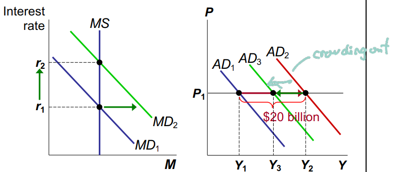 A \$20 billion increase in G initially shifts AD to the right by \$20 billion, but higher Y increases MD and r (MS is fixed), which reduces AD from I decreasing.