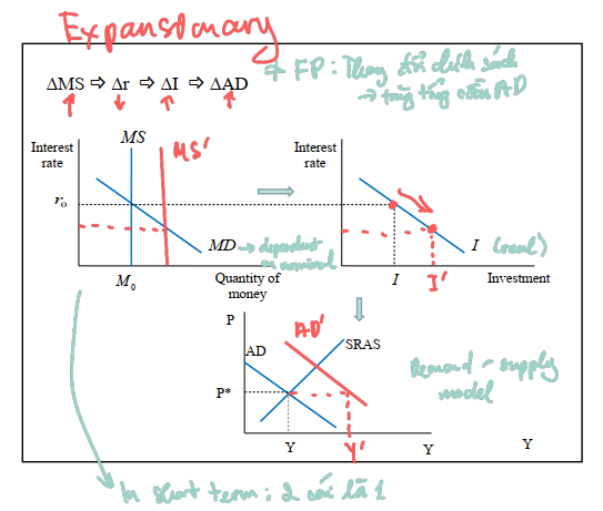 When the Fed increases money supply, the equilibrium interest falls, which increases the quantity of g&s demanded at a price level (giải thích cho graph 3 vì sao gióng ngang từ P sang =>increased quantity demanded at the same price level)
