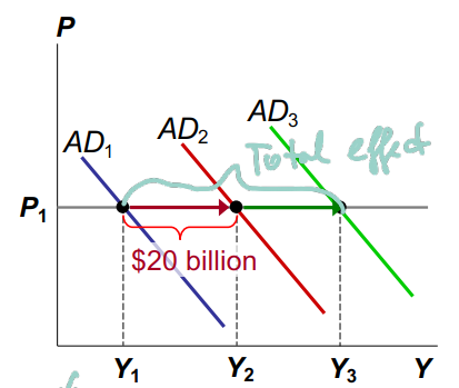 A \$20 billion increase in G initially shifts AD to the right by \$20 billion. The increase in Y causes C to rise, which shifts AD further to the right.