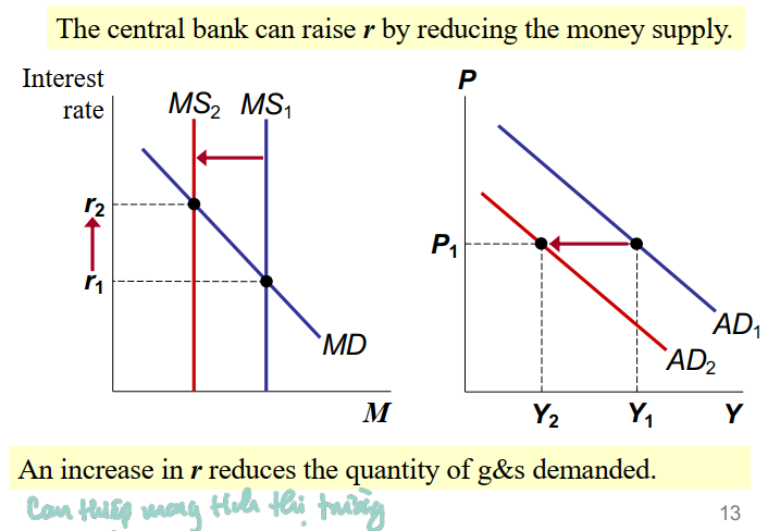 The central bank can raise the interest rate by reducing the money supply. An increase in the interest rate reduces the quantity of goods and services demanded.