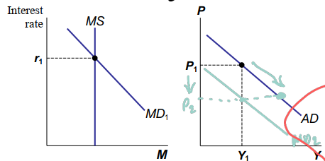 A fall in P reduces money demand, which lowers r