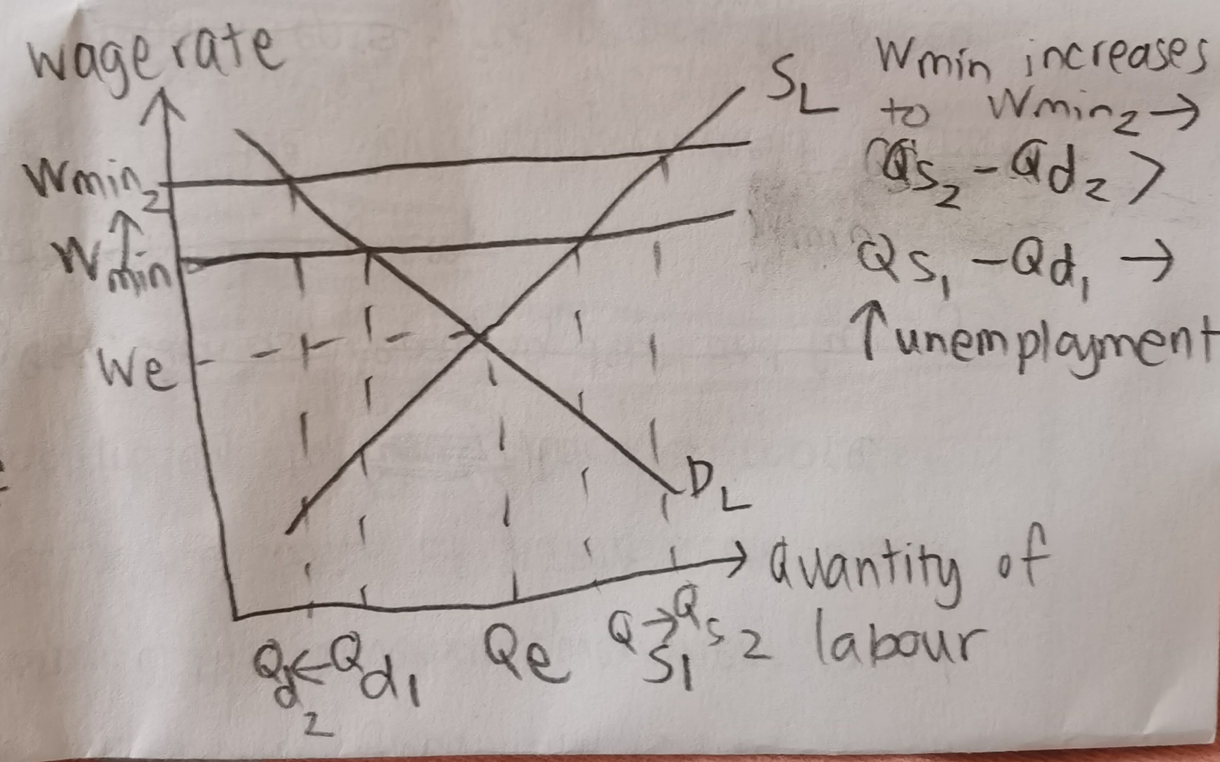 ↑ minimum wage → ↑ difference between supply and demand of labour → ↑ unemployment