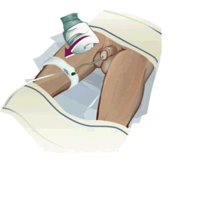 For male clients, first cleanse the upper thighs and then the insertion site of the catheter. For a circumcised male client, cleanse around the meatus and glans, working your way down the shaft of the penis to the scrotum. Remember to change sides of the washcloth to clean each area. If the client is uncircumcised, retract the foreskin, cleanse the head of the penis, then release the foreskin. Failure to replace the foreskin can result in a painful swelling episode that can make it difficult to return the foreskin to its expected position. For both, cleanse the scrotum to the anus, always using a clean side of the washcloth.