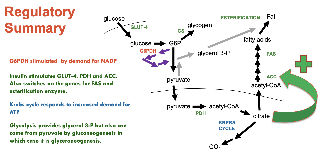 Illustrate the flow of substrates and key enzyme control points for lipogenesis