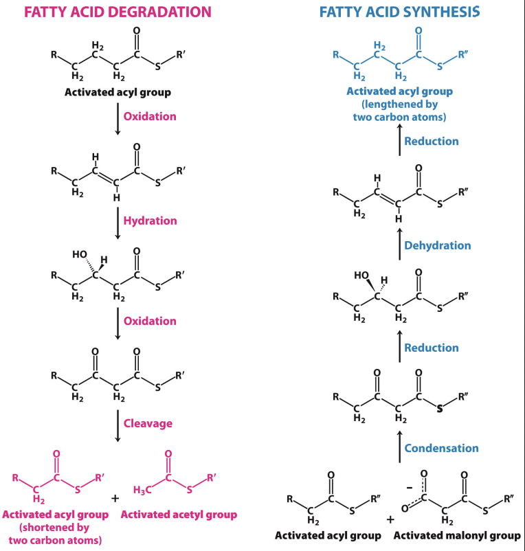 Lipogenesis = Reduction → dehydration → reduction (chain growing 2C at a time)
