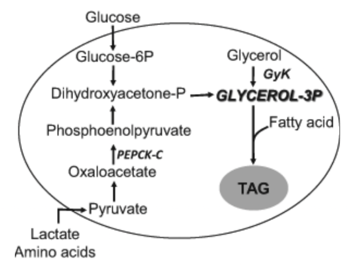If in fat tissue, go halfway down glycolysis and take glyceraldehyde 3-phosphate – reduce it to glycerol 3P