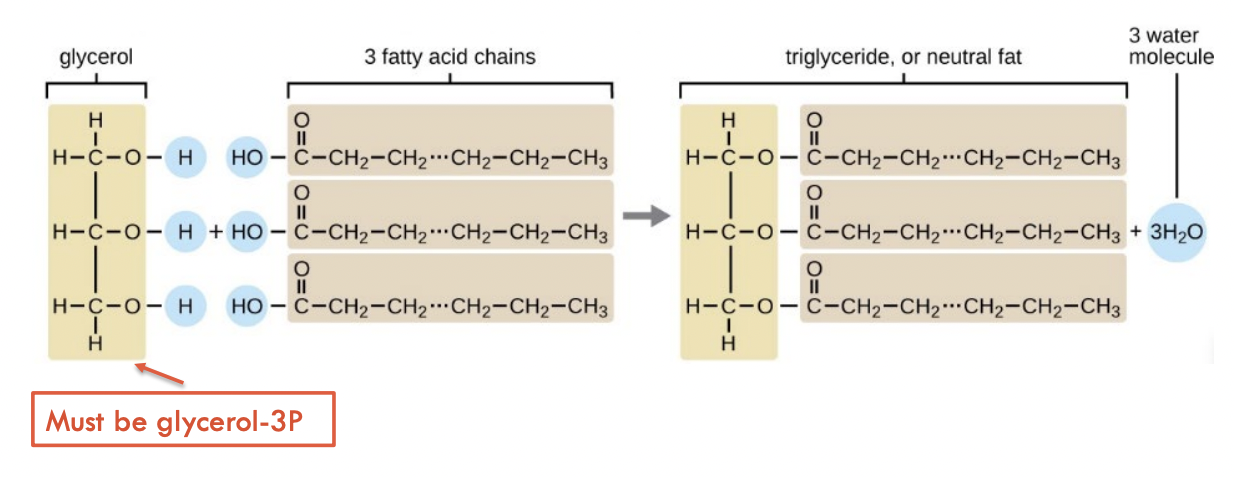 Join fatty acids to make triglycerides (3 fatty acids + glycerol) 3-phosphate (Esterification)