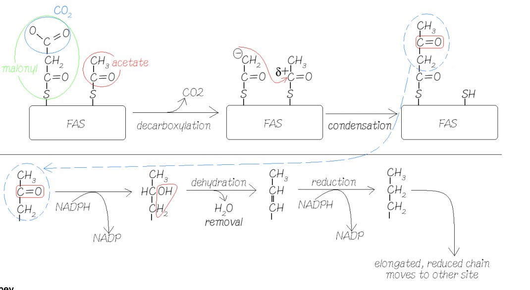 Describe the reaction sequence of fatty acyl synthase (FAS)