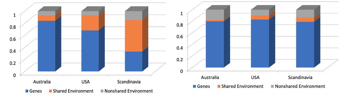 Reading comprehension has a genetic factor (0.61) but involves more environmental variance.