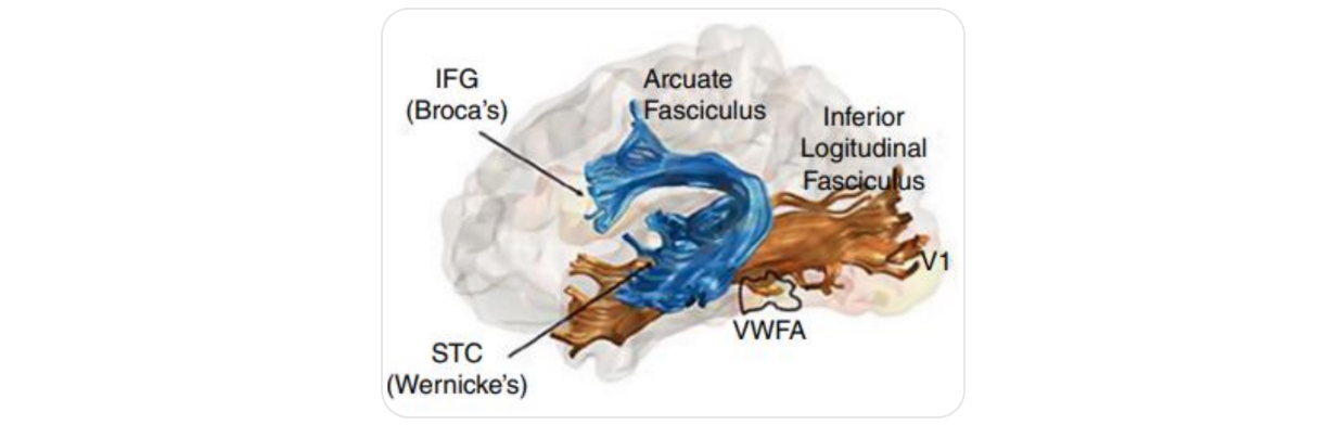 Arcuate Fasciculus: Connects visual areas (VWFA) to language regions.