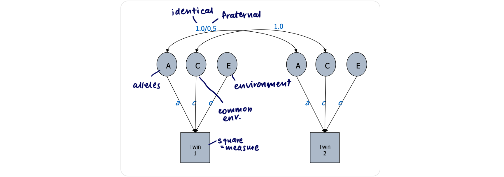 The ACE Model: Used to study heritability by partitioning sources of variance into Genetic impacts (A), Shared Environment (C), and Non-shared Environment (E).